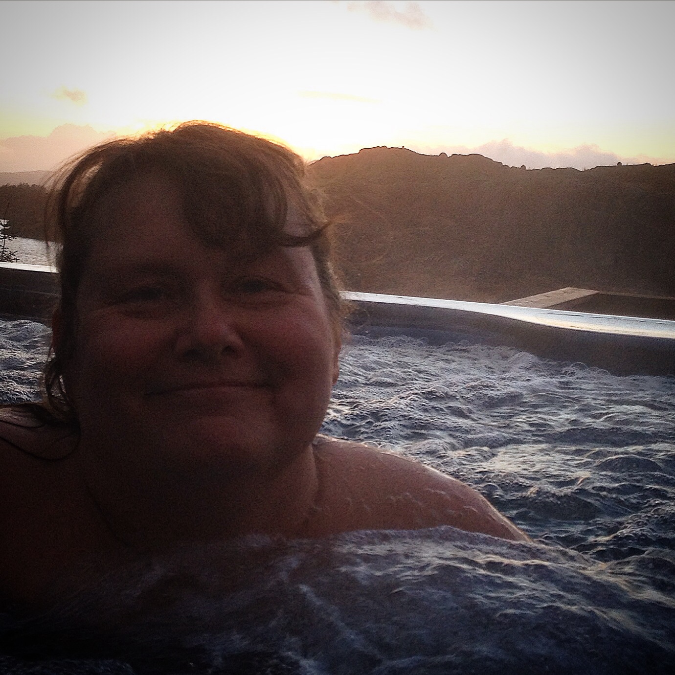 Sånn omtrent i sjutida tok me på oss badetøy og rigga oss til i jacuzzien med varmt badevatn med masse bobler i. Det fortsette me med den same aktiviteten, snakka, snakka, snakka, og le til me fekk vondt i magemusklane. Sola gjekk ned, månen stod opp og kvelden vart mørkare og mørkare. Me tende blått lys i botnen av bassenget, og ein fugl me ikkje klarte å identifisera kom og song for oss.