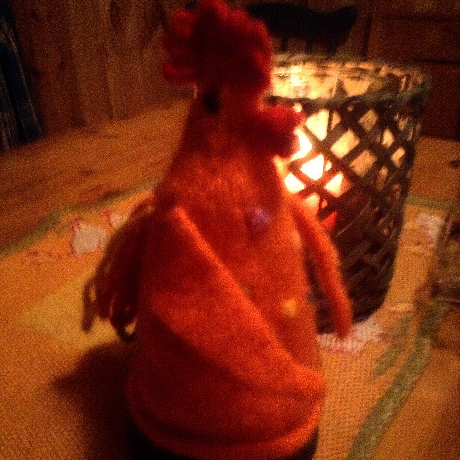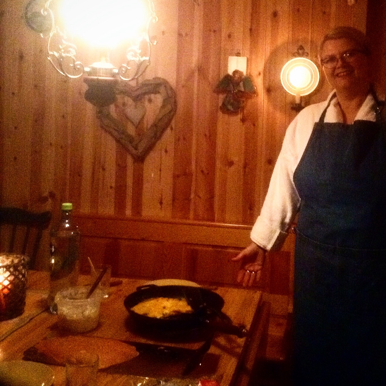 Då me kom oss opp av vatnet hadde fronten kome og, så det var eit tynt islag under føtene då me la loket på, og me måtte sinna oss forsiktig inn i hytta og vedomnvarmen. Me oppdaga til vår forskrekkelse at klokka var nesten ti og at det i grunnen var for seint for den planlagde reinsdyrsgryta som var planlagd til middag. I staden fann me fram restar av røykelaks og eggerøre frå lunsjen. Det smakte det og. Her er vertinna, denne gongen iført badekåpe forkle og lebestift, det er fornemt å vera på privat spa og retreat.
