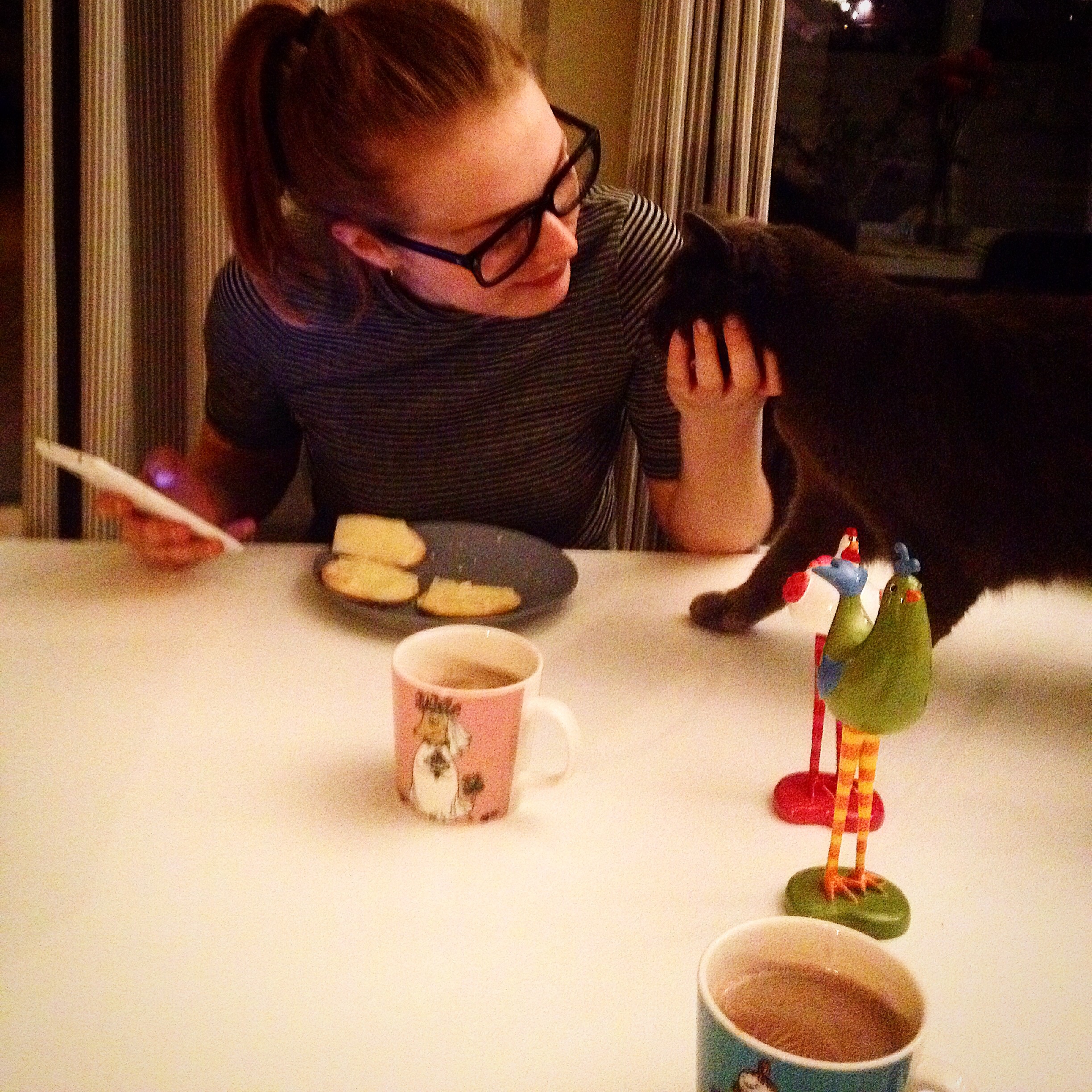 På stasjonen heime vart eg henta av Sunniva som sjølv nettopp var blitt henta på flyplassen. Heime venta Leif med middagen. Ingrid kom innom og fekk smaka på den nysteikte sjokoladekaka og om kvelden kom Odd Christian for å spela Bezzerwizzer. Eg forstår ikkje korfor eg tapar heile tida og Odd Christian alltid vinn… Er det taktikken som må finpussast, mon tru? Nå manglar me bare Halvard. Eg har ei barnsleg glede ved å samla ungane mine rundt meg. Cleopatra, katten vår, er alltid overlukkeleg når Sunniva kjem heim, og vik nesten ikkje frå henne verken dag eller natt. Då Sunniva sovna på sofaen med eit teppe over seg, sov katten malande på magen hennar oppå teppet.