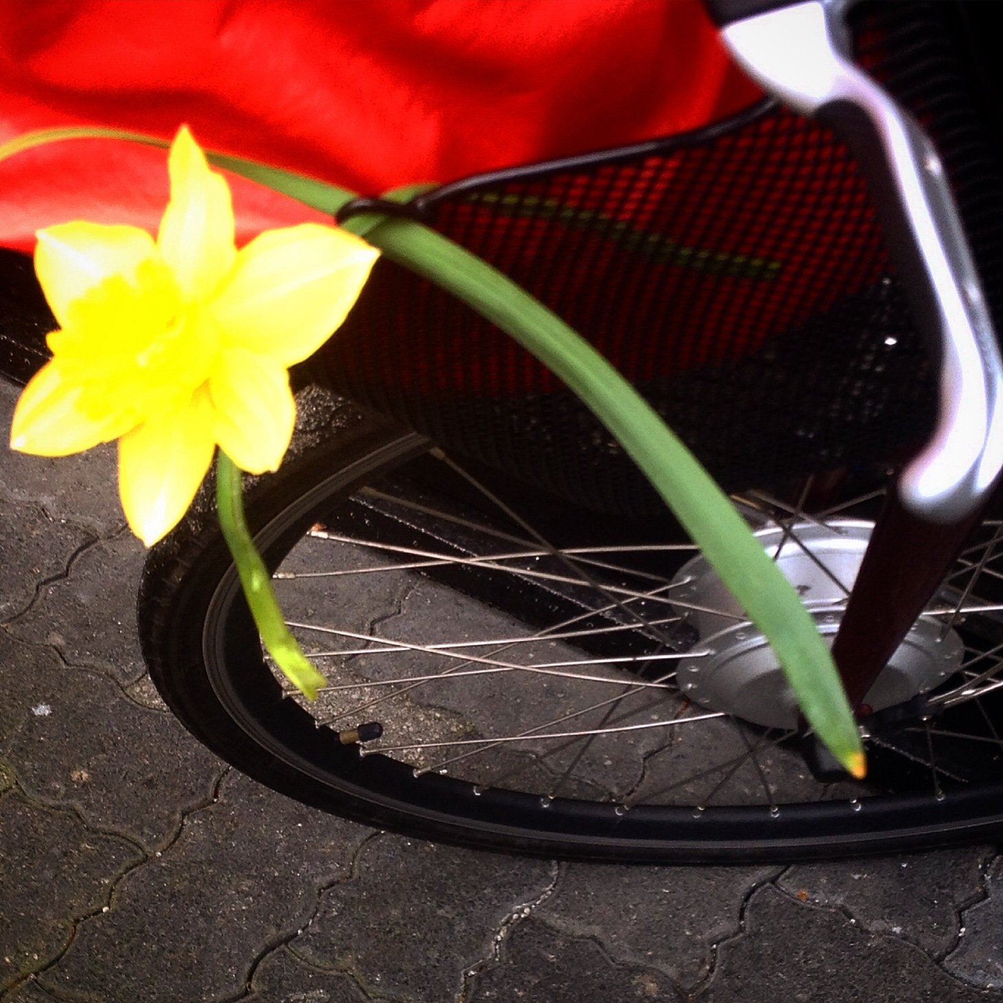 Då eg sykla heim att, hadde eg ingen ledige hender eller ledig korgplass til mi påskelilje, så den vart festa på utsida av sykkelkorga der den store knallraude bagen med Theodora og sundagsskulerekvisittar tok heile plassen på innsida.