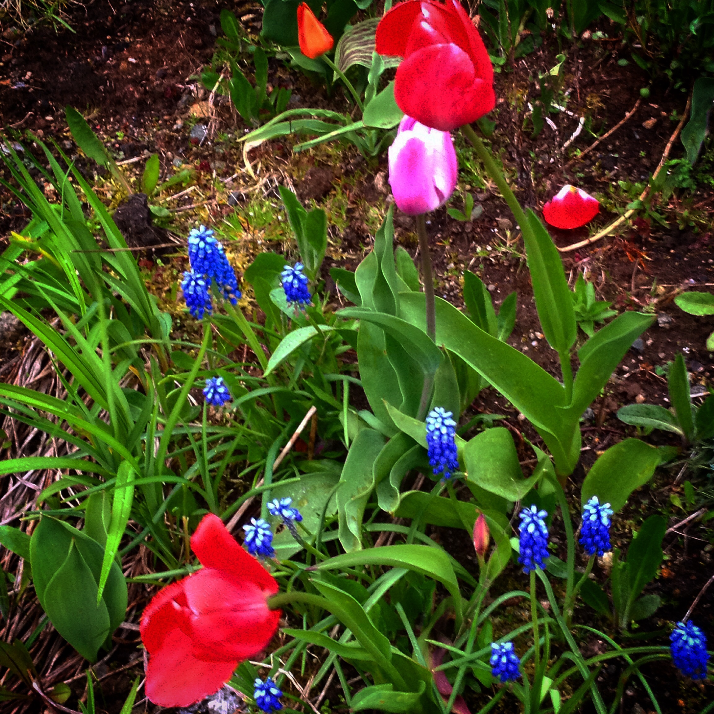 Og hagen vår er slett ikkje nokon pryd for nabolaget, men det blømer i litt ugrasovergrodde bed, som me nok skal få tid til å luka når det bare blir litt varmare så me slepp å frysa sånn på fingrane. Visst har me både perleblomar og tulipanar. Ei strofe som eg grunna litt på då eg i tidleg barneskulealder sat i kyrkja på skulegudsteneste på 17. mai på sida av frøken, Gerd Signy, og song nasjonale festsongar: «Om sædet enn gror på ymist lag, det brødder då etter plogen». Eg forstod ikkje orda heilt, men dei var fine…, akkurat som bukettane med bjørk og kvitveis med ein plastpose nederst, festa på enden av kyrkjebenkjene var fine. Lærarane sat med desse rare svarte luene med ein stor dusk på aksla. Det såg både høgtideleg og ganske rart ut. Mor sa at det heitte studenterluer. Det høyrdest fint ut. Eg kan i grunnen ikkje huska at det var andre enn lærarane som brukte dei. I tillegg hadde dei 17.mai-sløyfer som gjekk nesten til bakken. Dette med at det «gror på ymist lag, men brødder då etter plogen,» syneste eg framleis passar på beda våre, sjølv om det heilt opplagd ingen plog dit skal koma. Optimistisk set me i gang med blomsterlauk, blomsterfrø og store mengdar stauder kvar vår. Spiringsprosenten er oppsiktsvekkjande låg, og me set i gang konkurrerande bedprosjekt utan å fortelja kvarandre om det. Plutseleg er det fullt av blomsterløk der eg prøver å grava ned ei tue med valmuer eller lupiner. Me har eit stort utviklingspotensiale på hagefronten, og det må vel vera fint… Ingen bed er så planlaust spontant samansette som våre, men dei gjenspeglar kanskje eit eller anna…