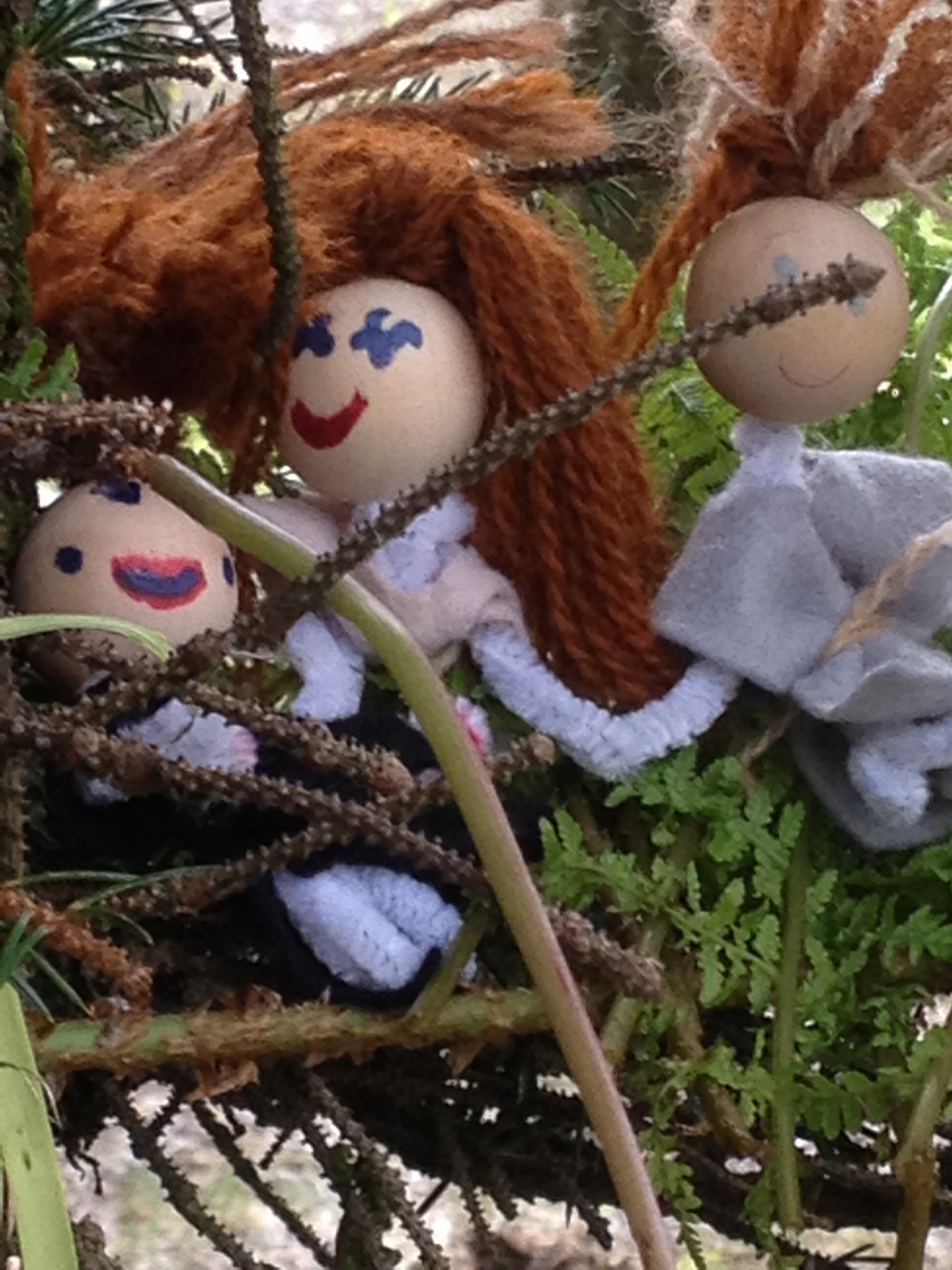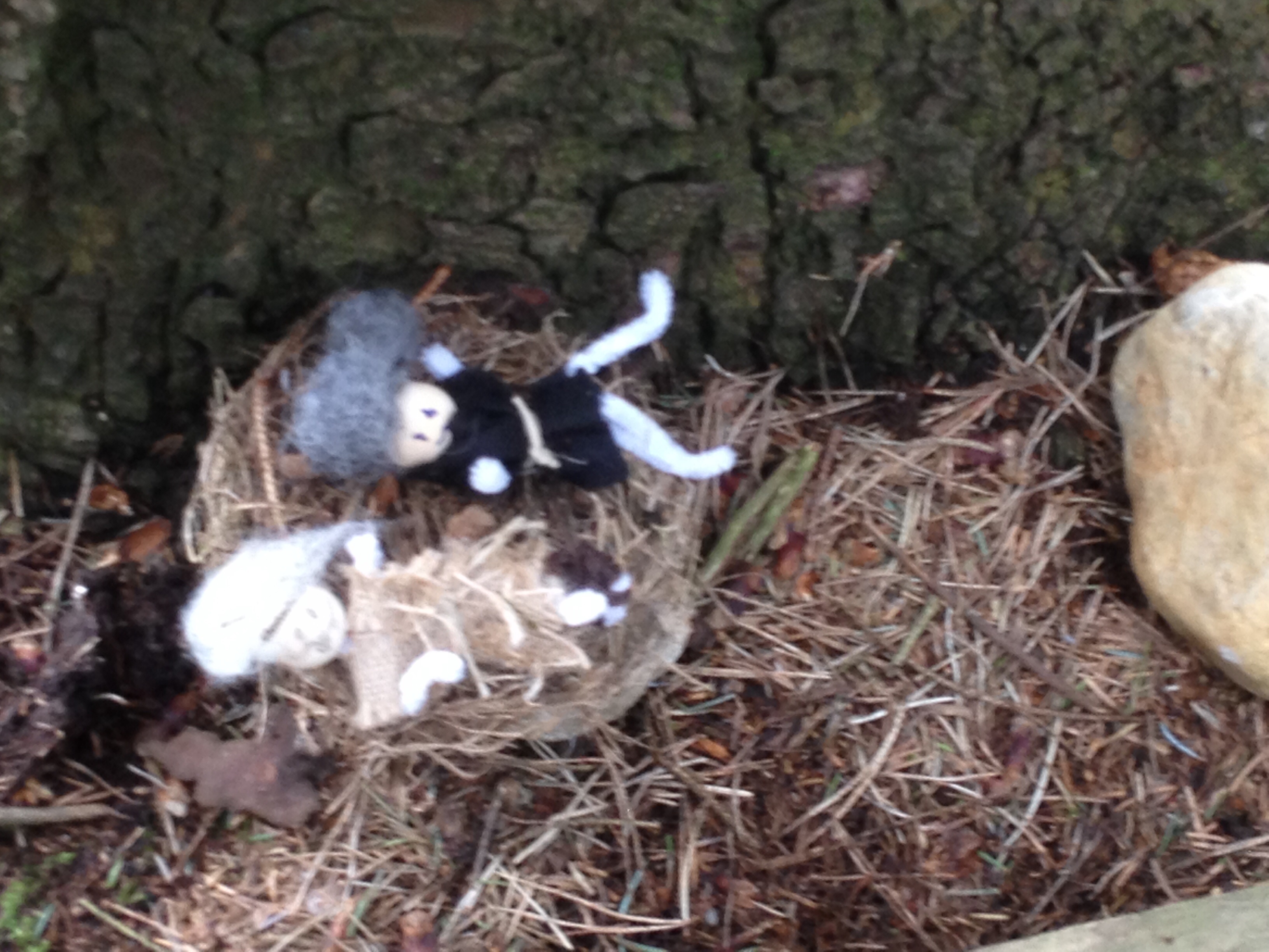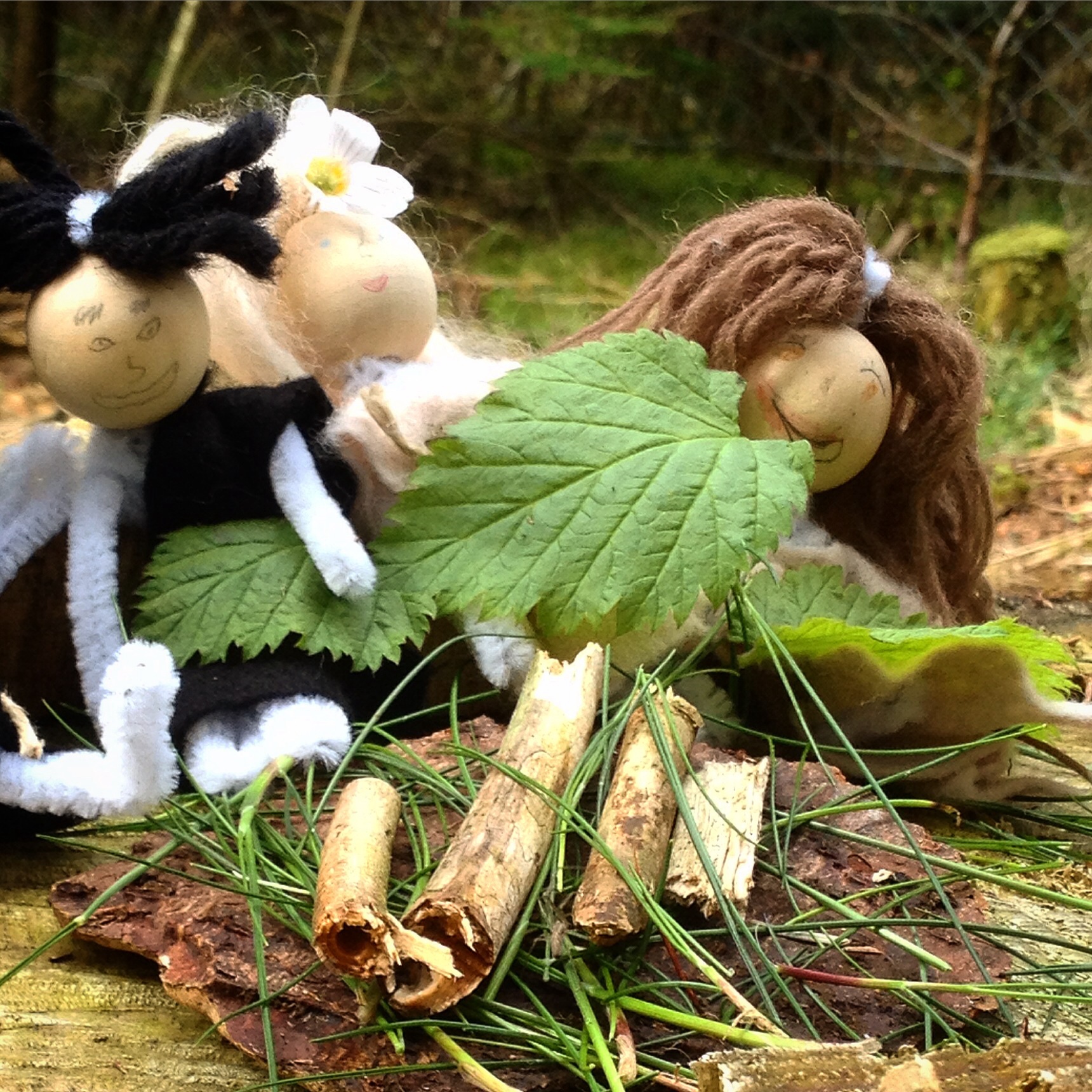 Og familien rundt dette bålet fekk varme pledd av grøne blad. Ein av dei herlege tinga med ungar, er at leiken ikkje let seg diktera av vaksen snusfornuft om korleis ting eigentleg bør henga saman. Den eine familien hadde husdyr, ein stor svart snegle og to meitemarkar. Då eg spurde med lærarpedagogisk stemme om sneglen var ein okse eller ein svart sau, fekk eg til svar at det var ein kjempesnegle som heitte Kong Harald. Så då så… Det er ikkje alle forunt å få leika med dokker når dei er på jobb…