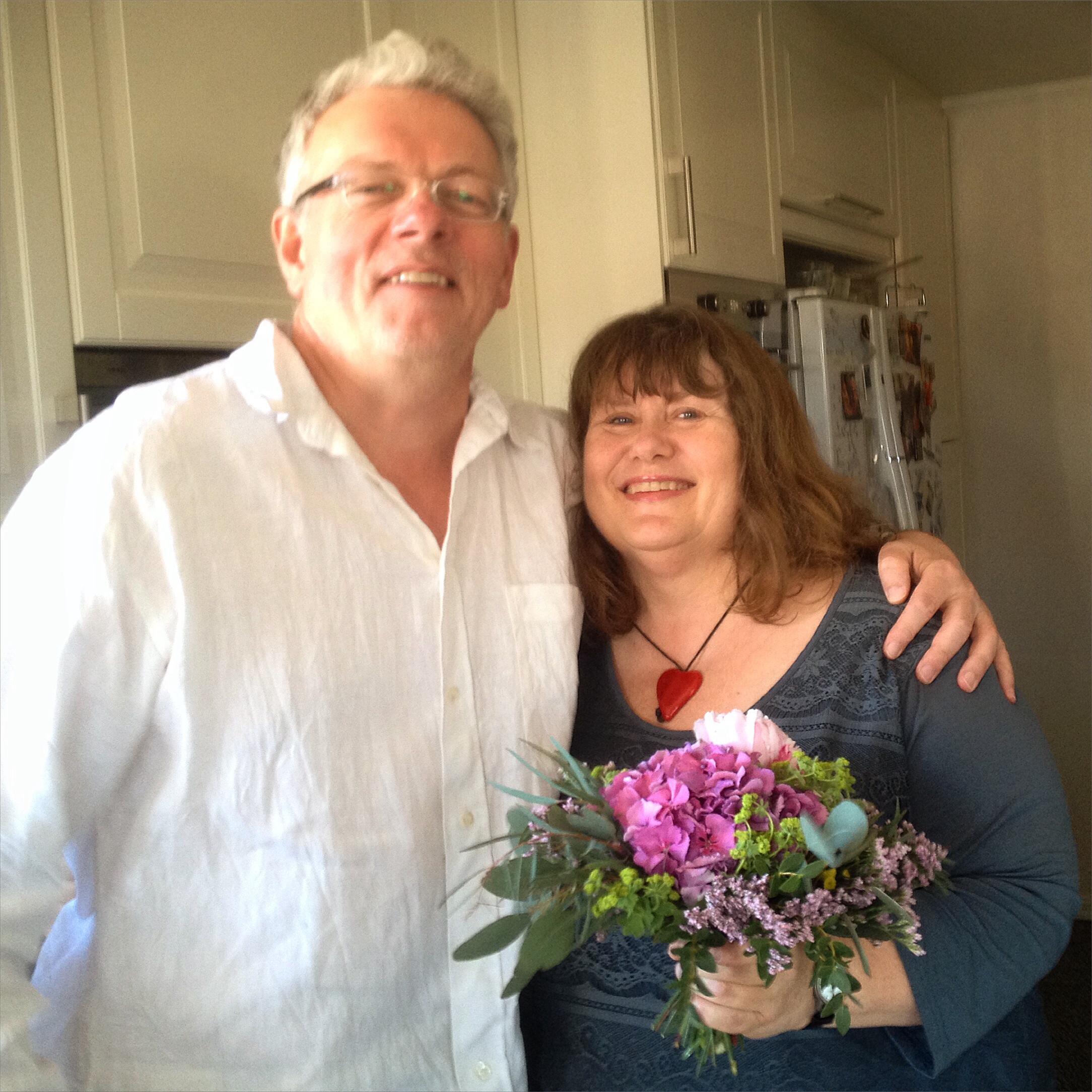 Eg må vel rett og slett innrømma at dette rett og slett liknar meir på oss enn biletet øverst gjer. Me fekk reine brurebuketten på fredag, så då måtte me leika brurepar. I dag har me hatt endå meir feiring av både det eine og det andre med storfamilien rundt bordet og etterpå endå meir vennebesøk.