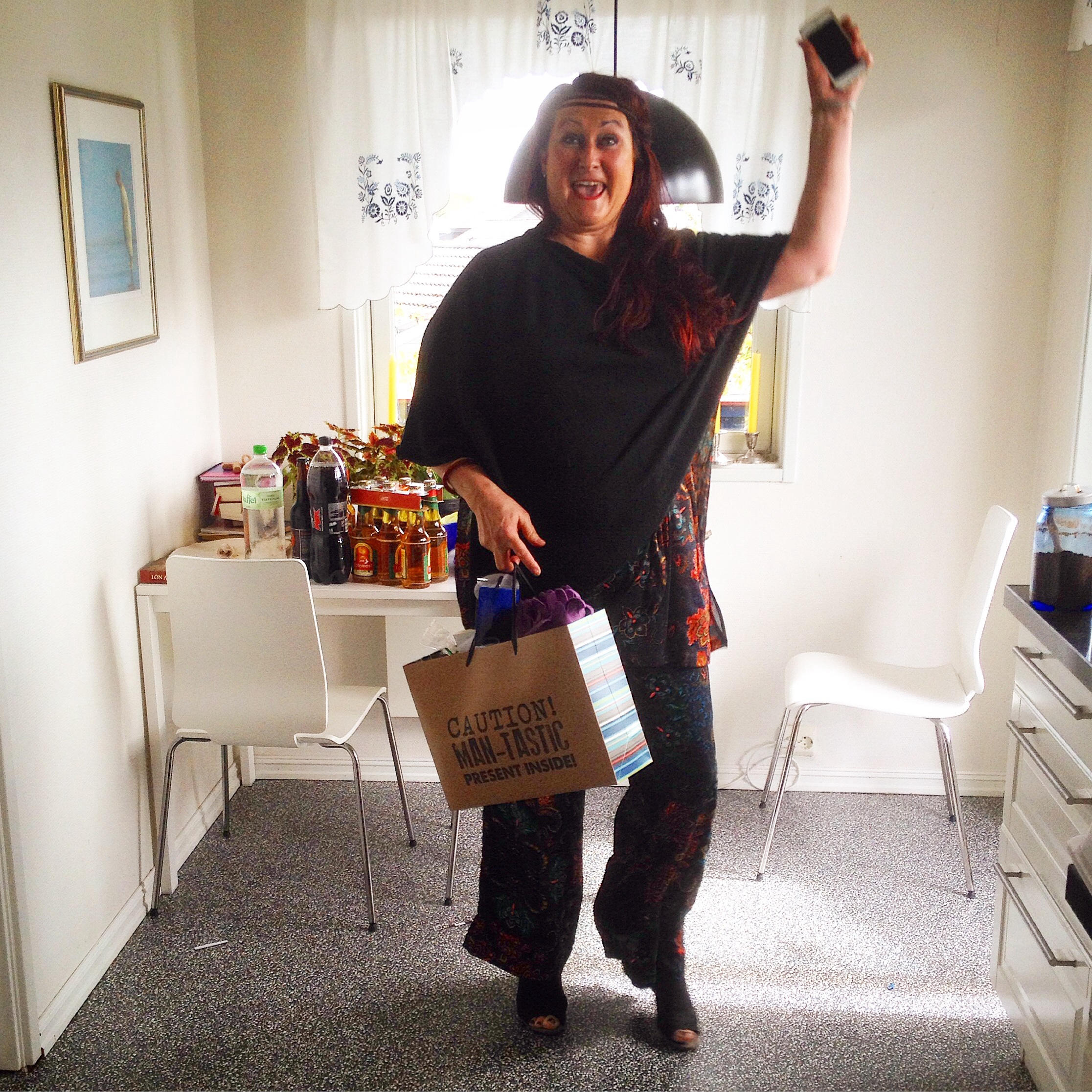 Ei ellevill syster dukka opp med ein pose full av gåver.