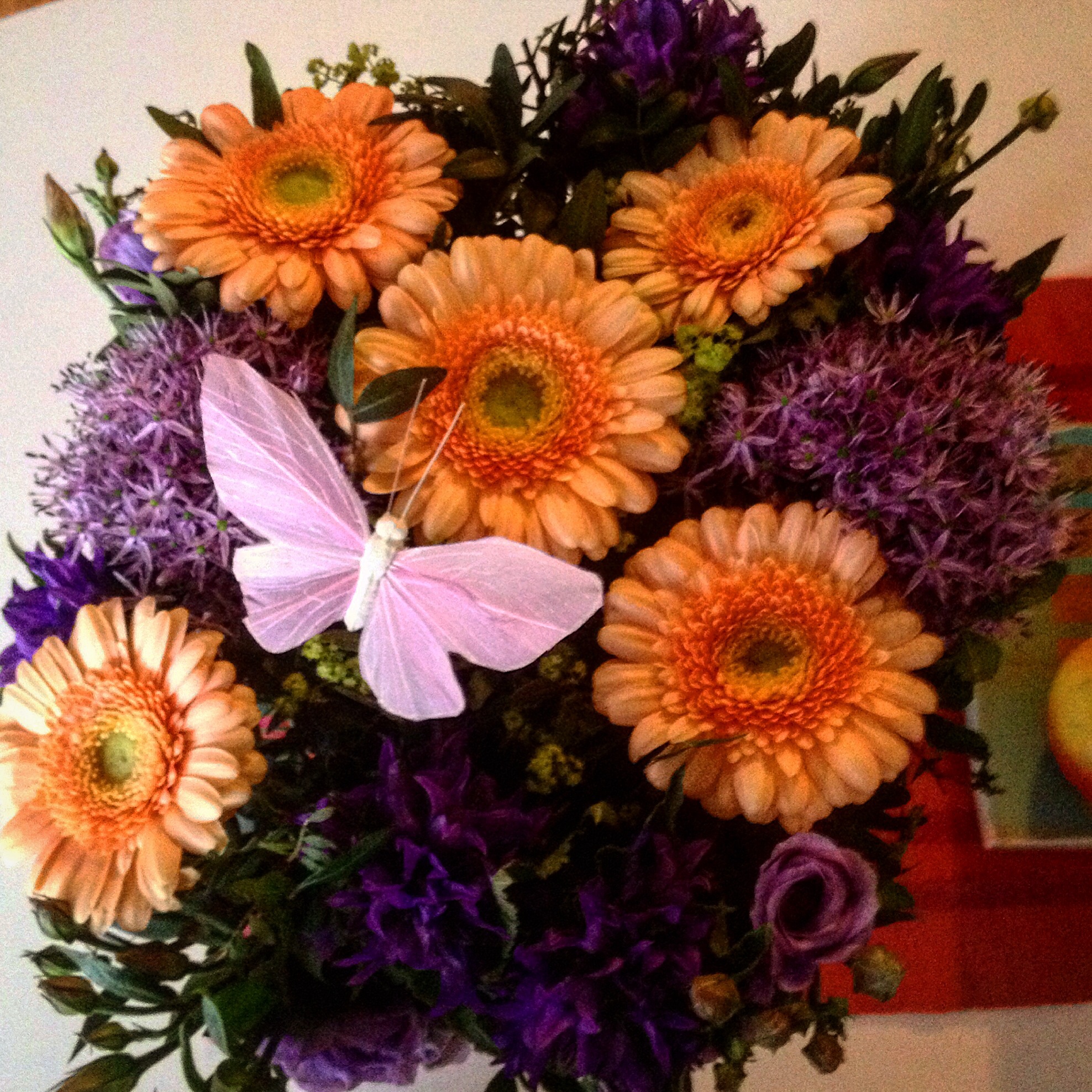 Då eg kom heim var eg sliten på ein god måte både i hovudet og i kroppen. Eg la meg flatt på sofaen i eit kvarters tid, og det lukta så godt av blomar i stova. Eg har sjeldan hatt så mange fine blomar som akkurat nå, nokre har stått fine heilt sidan me feira bryllaupsdag og gebursdag og andre har me fått i samband med kurs, avslutningar og diverse. Det er ikkje så dumt å ha sommar inne når det er litt for kaldt for hageliv.