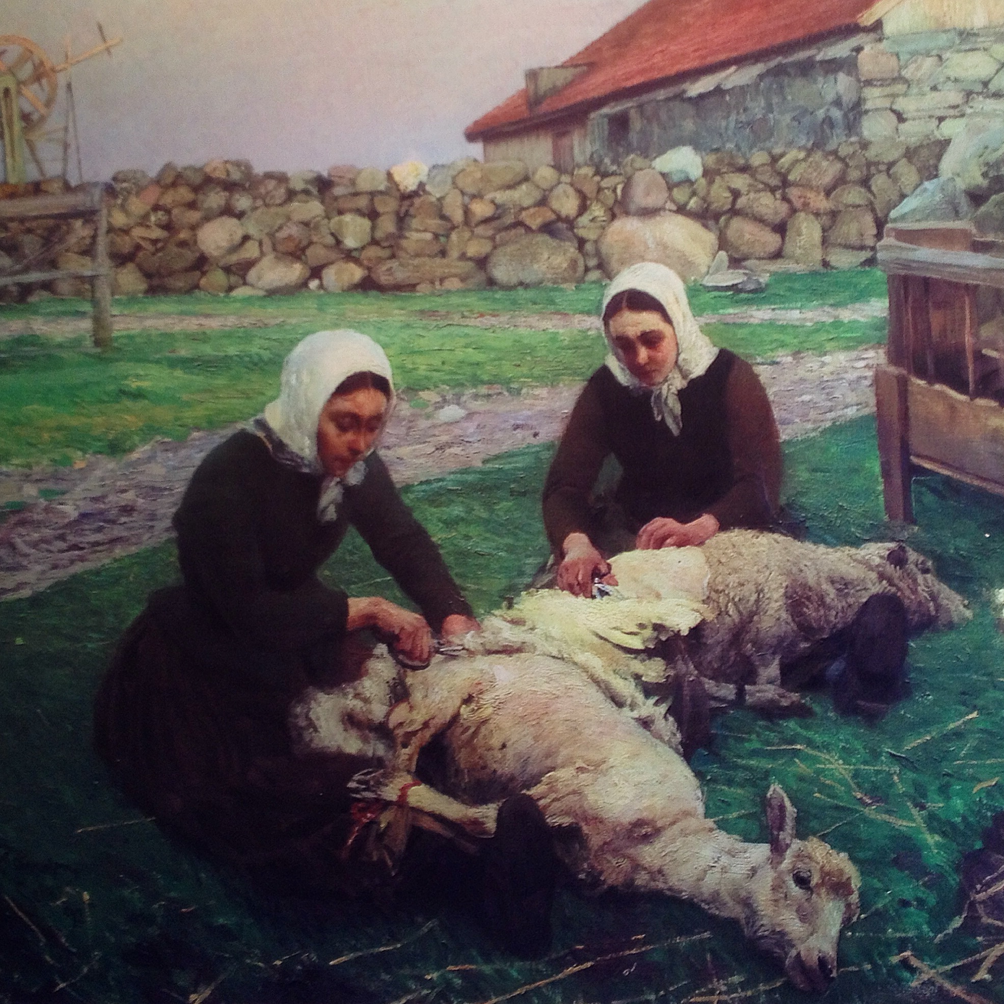 Me såg på ei fin utstilling om Eilif Pettersen og kunstnarkolonien på Jæren. Maleria gir eit ganske godt bilete av korleis livet her kunne vera på denne tida. Halvparten av formødrene mine var frå Jæren, og det er ikkje utenkjeleg at ein del av dei hadde svarte kjolar og kvite skaut og var ganske flinke til å klippa sauer…