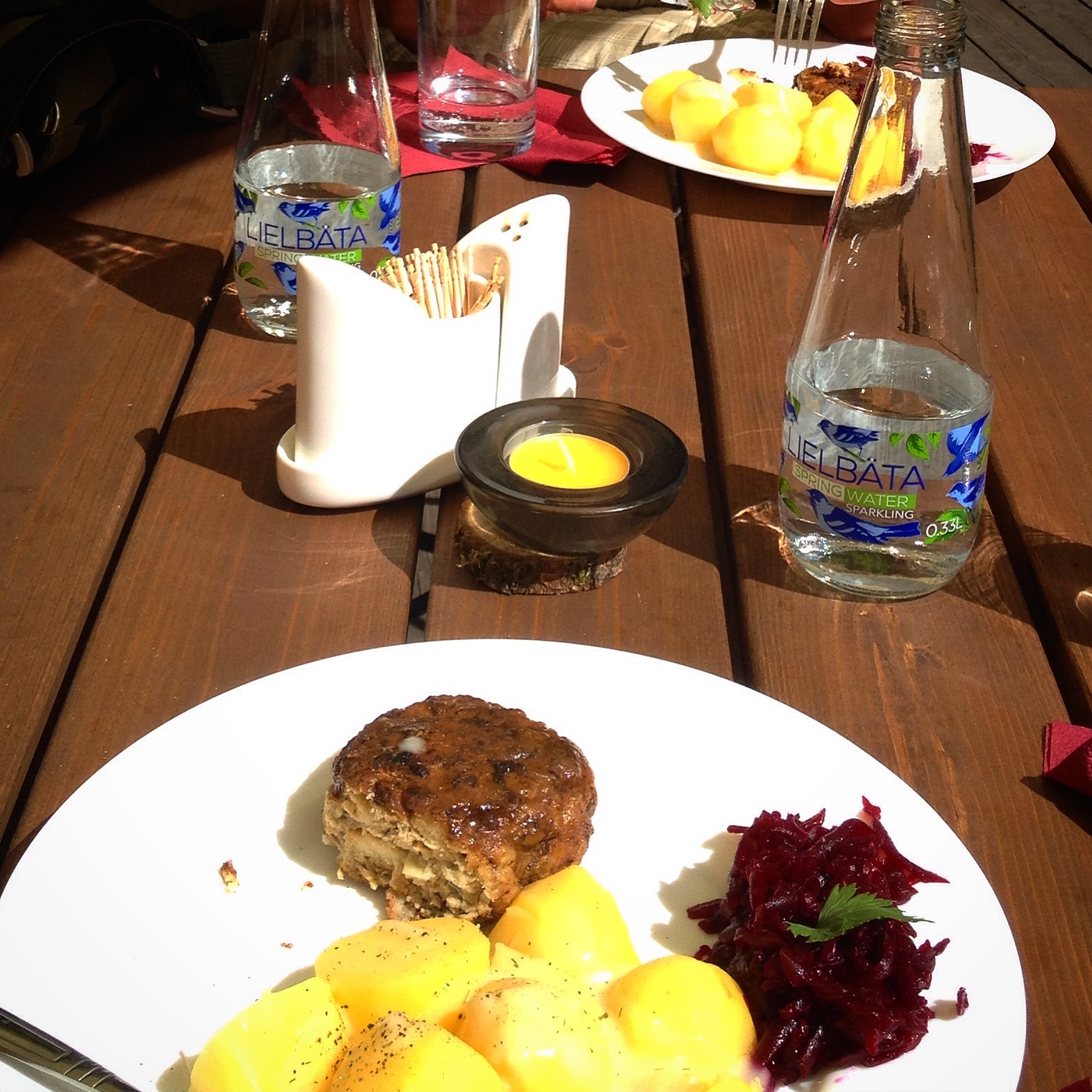 Neste rett var ei ganske stor kjøttkake med løk og karve i. Dei er glad i karve her, og det er eg og. Bortsett frå karven så var det ikkje ulikt ei gammaldags norsk kjøttkake. Til denne vart det servert kokte småpoteter med lys saus over og raudkål med persille.