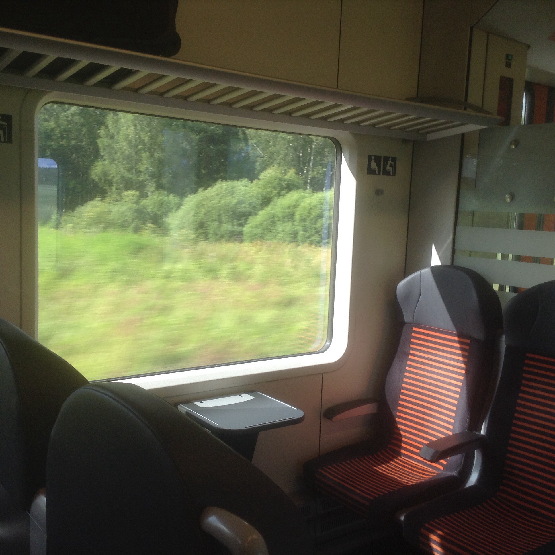 Dette toget er veldig moderne i forhold til det forrige, det er lyst og luftig med stripete seter i oransje og svart. Det einaste problemet me har nå er at me er usikre på om me må skifta tog eller ikkje. Konduktørdama snakka absolutt ikkje engelsk. Eg tolkar informasjonen som at me skal byta tog i Tartu. Leif trur ikkje det. Det er ein time til me er der, så det skal me klara å finna ut…