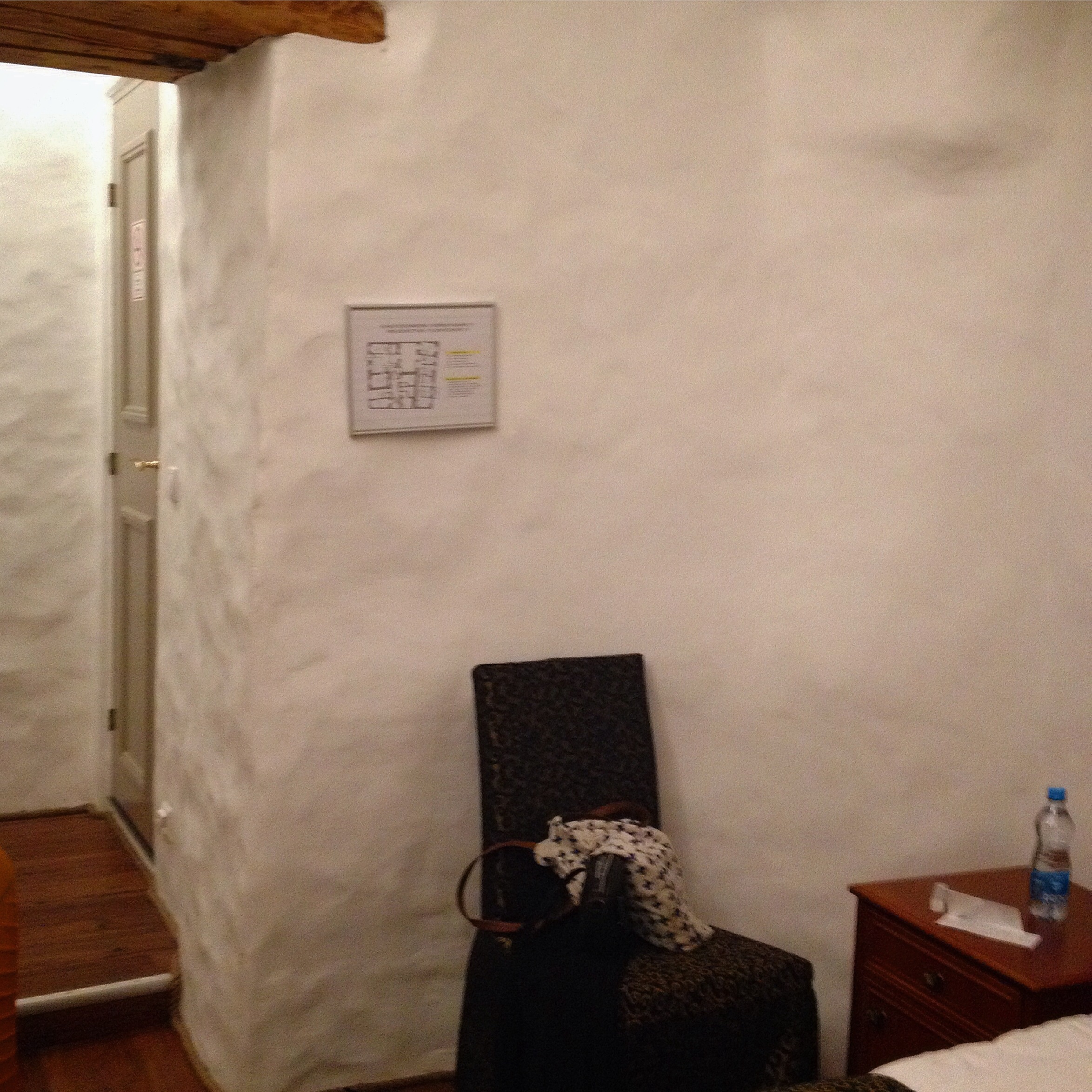 Etter omtrent eit kvarters gange med trillekoffertane våre, så var me ved hotellet vårt i gamlebyen i Tallinn. Me bur i eit middelalderhus i ei av dei gamle gatene i indre delen av gamlebyen. Det er eit slikt murhus med bindingsverk og metertjukke vegger. Rommet vårt ligg delvis under gatenivå med eit lite vindauge høgt oppe på veggen. Det minner i grunnen ganske mykje om ei klostercelle, og det i seg sjølv er jo interessant.