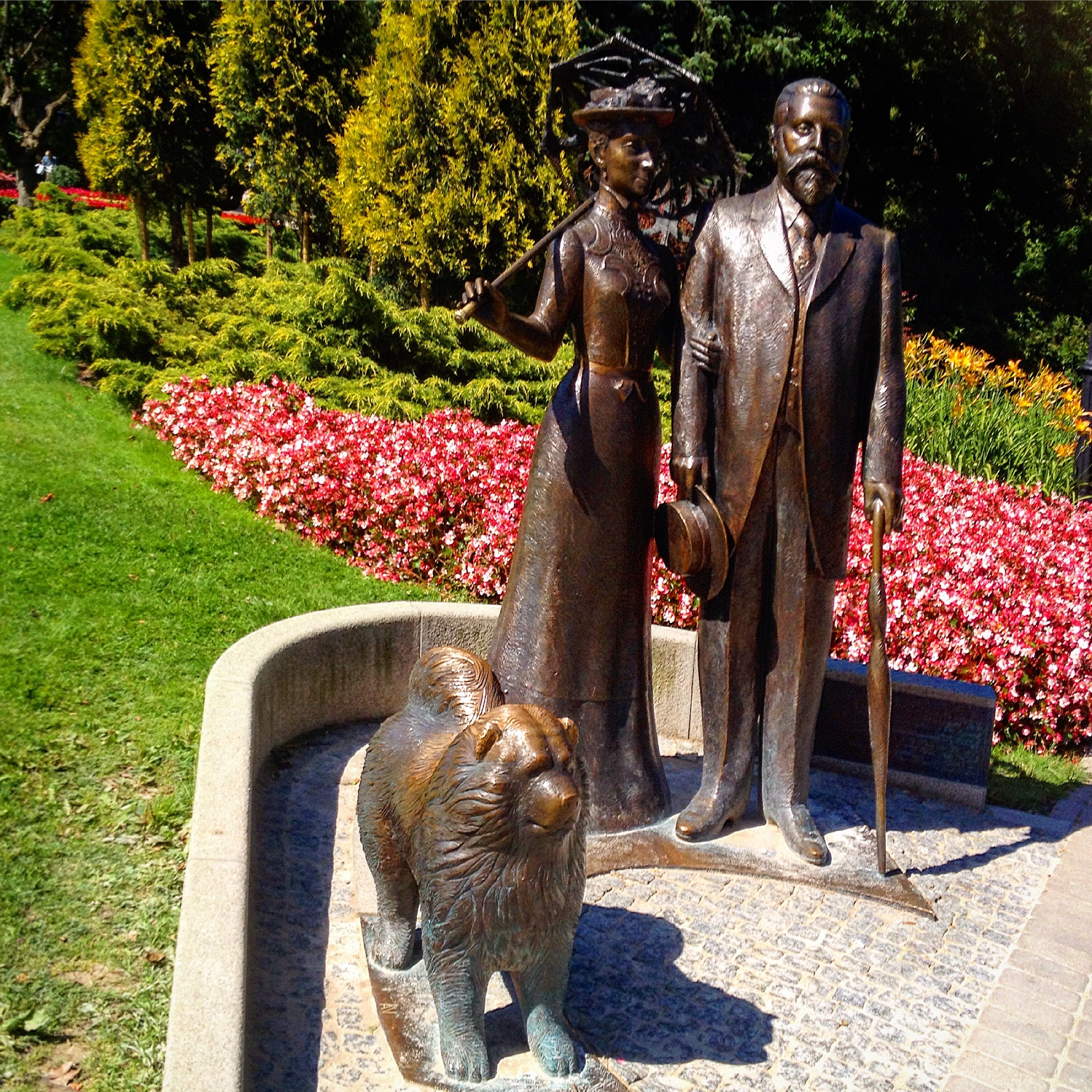 Det var og befriande å høyra nokre oppbyggelige historiar. Dette fine paret med hund fann me i ein park. Me spurde ei forbipasserande dame kven det skulle forestilla.