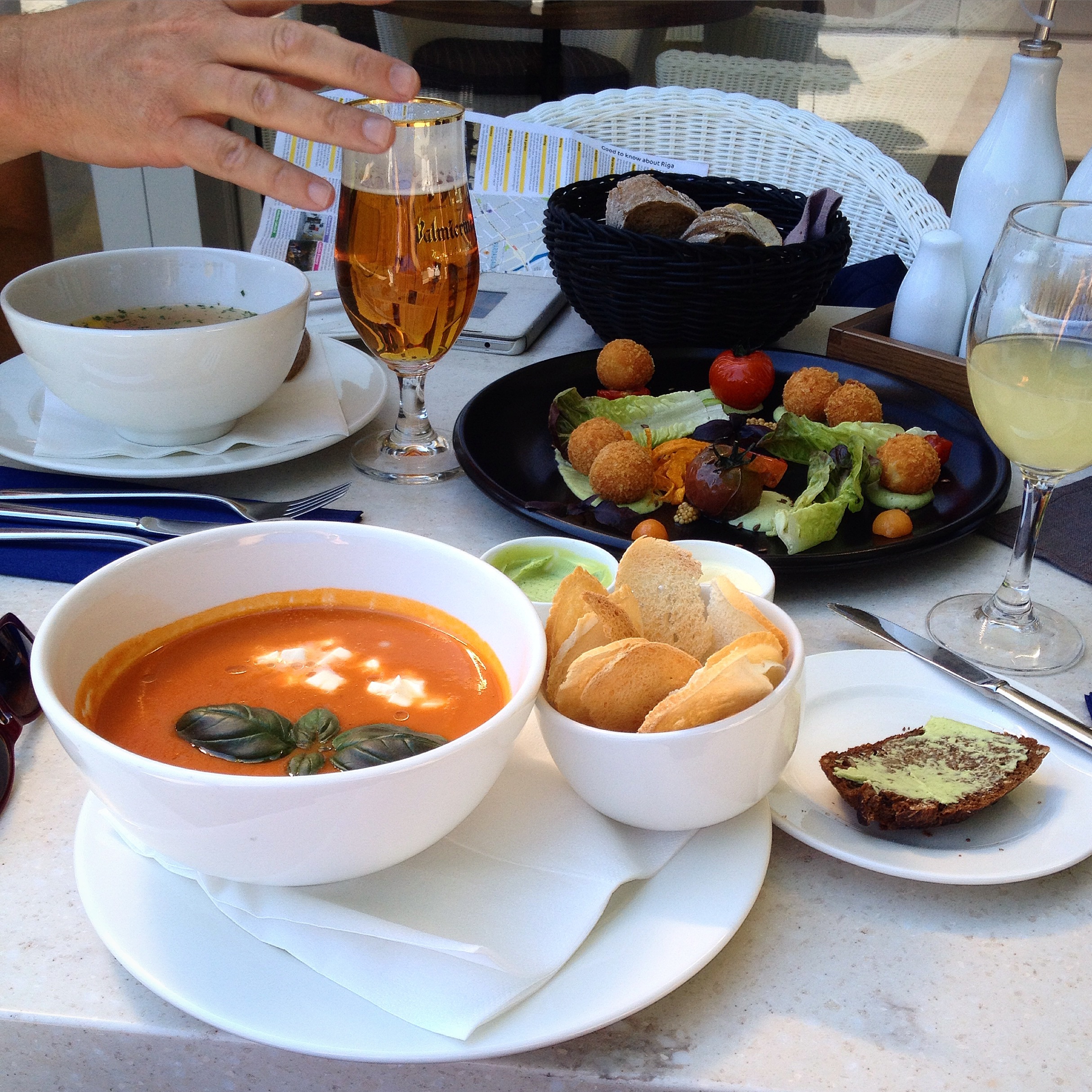 Dette smakte fantastisk godt. Tomatsuppe med mozzarella laga på friske tomatar, ostekrokettar, grilla cherrytomatar og latvisk brød.