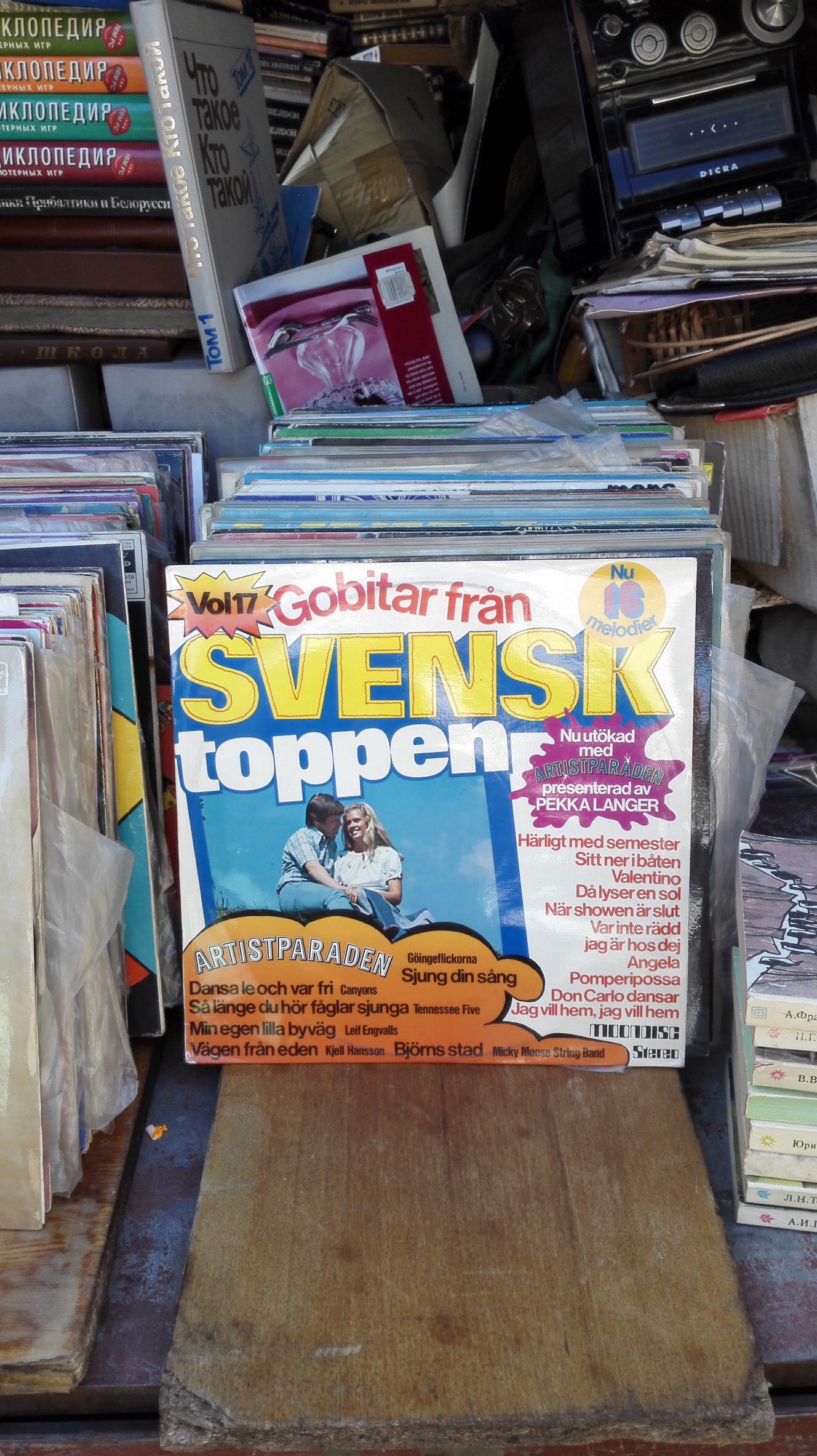 Og sjå for eit scoop mellom andre gamle plater og bøker… Me kjøpte ho ikkje, sjølv om både Halvard og Sunniva samlar på vinyl… Til gjengjeld fekk kjærasten min gjera ein god handel ved å kjøpa ein halv rull godt brukbar gaffateip for nesten ingen ting. Så var han fornøgd.