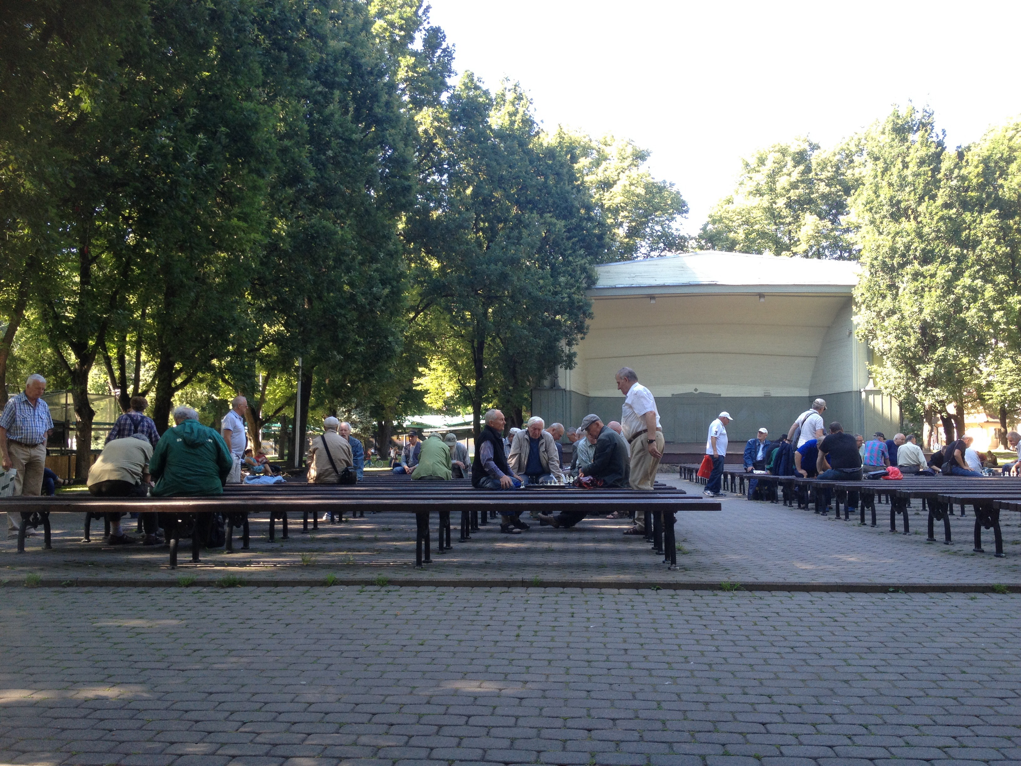 Nå har me trava byen på kryss og tvers i to dagar, og føtene er trøytte og litt såre. Dette er den desidert varmaste sommerdagen me har opplevd i år. Dersom vêret er like fint i morgon, kan det vera at me brukar den siste heile feriedagen på å dra på badetur til Jurmala. Det er veldig mange fine parkar her der folk kosar seg i finveret. Eg sluttar med nokre parkbilete. Mennene på det eine biletet spelar sjakk. Det var tydelegvis ei fast plass der folk, spesielt godt vaksne menn tok med sjakkspelet sitt for å møta andre spelarar. Leif gjekk bort for å kikka, og fekk straks tilbod om eit parti sjakk. Eg meinte at det måtte han få med seg, men av ein eller annan grunn ville han heller til hotellet for å kvila.
