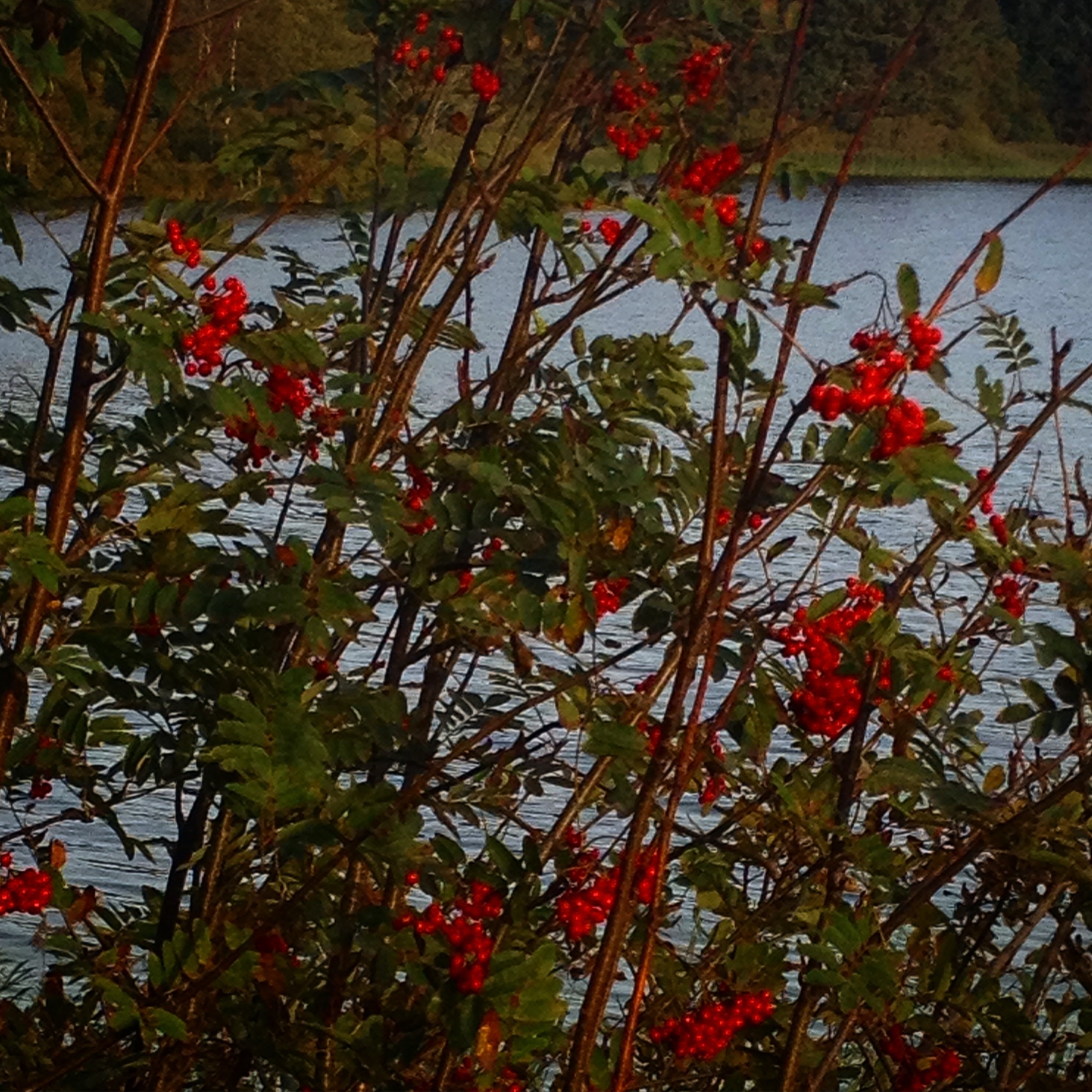 Eg såg heile tida ting eg hadde lyst til å fotografera. Av og til hadde det vore fint med eit litt meir avansert kamera enn det eg har på mobilen, men det er nå utruleg praktisk å ikkje trenga å bera på ekstra fotoutstyr. Reinfannen står med kvit ull nå, raunbæra lyser raude, vannliljene ligg der framleis og dei siste markblomane står og blømer. På markene langs vatnet beitar det kyr og ute på vatnet er det ein flokk med svaner. Det var mykje folk ute og jogga, sykla og gjekk tur, eg møtte og to store hestar med ryttarar. På vatnet låg det av alle ting ein ganske stor båt. Eg lurer på om det er ein slags arbeidsbåt som ligg der i samband med gangbrua som skal byggjast over vatnet. Lufta hadde dette skarpe kjølege draget som fortel at det ikkje er sommar lenger sjølv om sola skin. Eg trur eg avsluttar med å by på ein liten smak av det eg har skrive i dag. Det er litt galskap å presentera ting som ikkje har fått liggja til ettertanke ei stund, men det får vel våga seg…