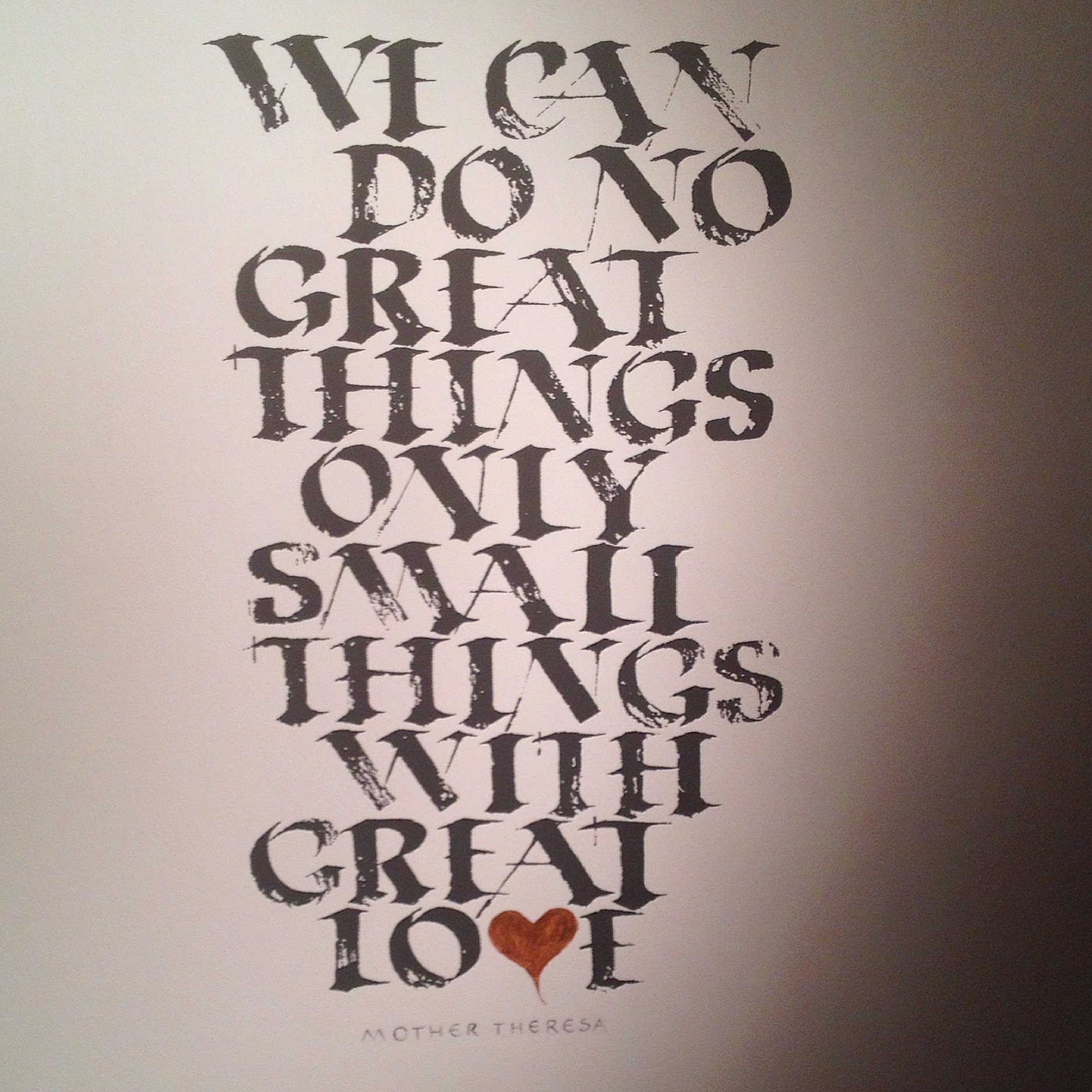 Og dette biletet blir lodda ut blant alle som har vore innom for å sjå utstillinga. Det var så fint at eg måtte tilbake i loddbøtta for å kontrollera at eg hadde skrive rett telefonnummer på lappan. Nettopp Moder Theresa har eg jo fylgt gjennom daglege tekstar nå i 2o15, og det gjer kanskje at biletet kommuniserer litt ekstra godt med hjartet mitt.