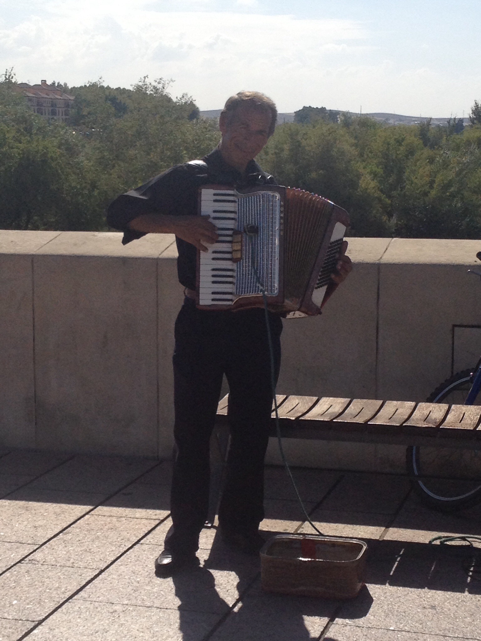 I Cordoba var det ei fin gangbru over ei stor elv der folk spaserte og stoppa for å sjå på utsikten. Statuemannen som haldt til der hadde hoppa ned frå sokkelen for å ta seg ein røykepause første gong me passere, men då me gjekk tilbake etter å ha drukke kaffi og ete is, hadde han klatra opp og stod i frys att. Denne blide mannen stod der og spelte tangoar på trekkspelet sitt. Han var veldig flink.