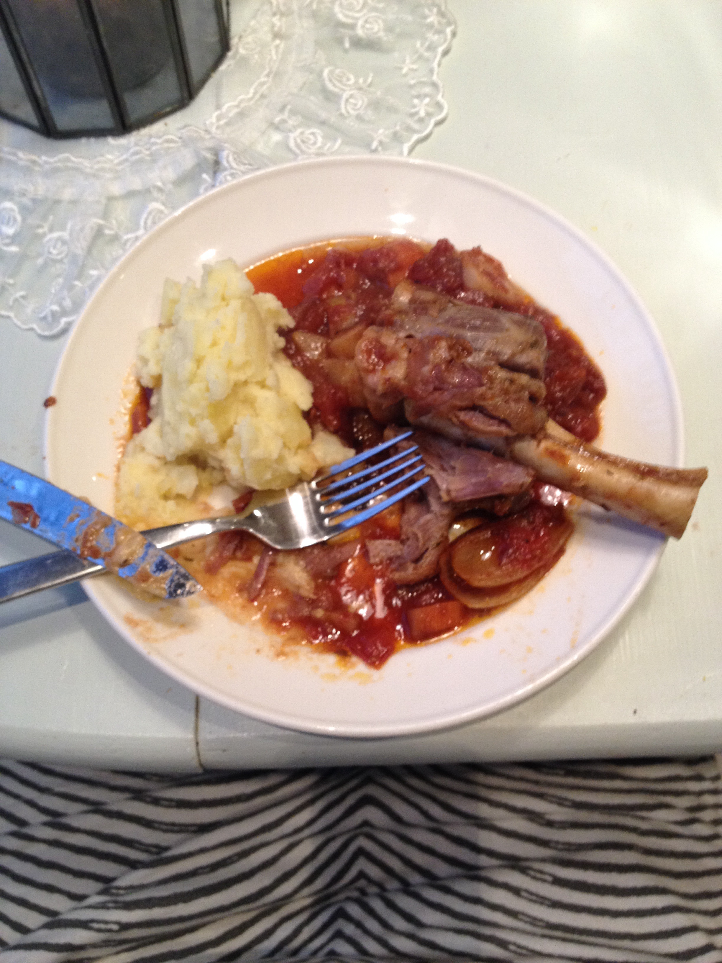 Eva Mari har gjort klar i fleire døgn til ein skikkeleg gourmetmiddag for storfamilien, og før eg reiste fekk eg servert lammeskanke i rødvinssaus med kvitløkstilsett potetmos. Spør du meg så var det eit ganske ambisiøst prosjekt for ein travel barnepassar, men det vart drege i land med stil. Nå må eg posta før me mistar dekninga:)
