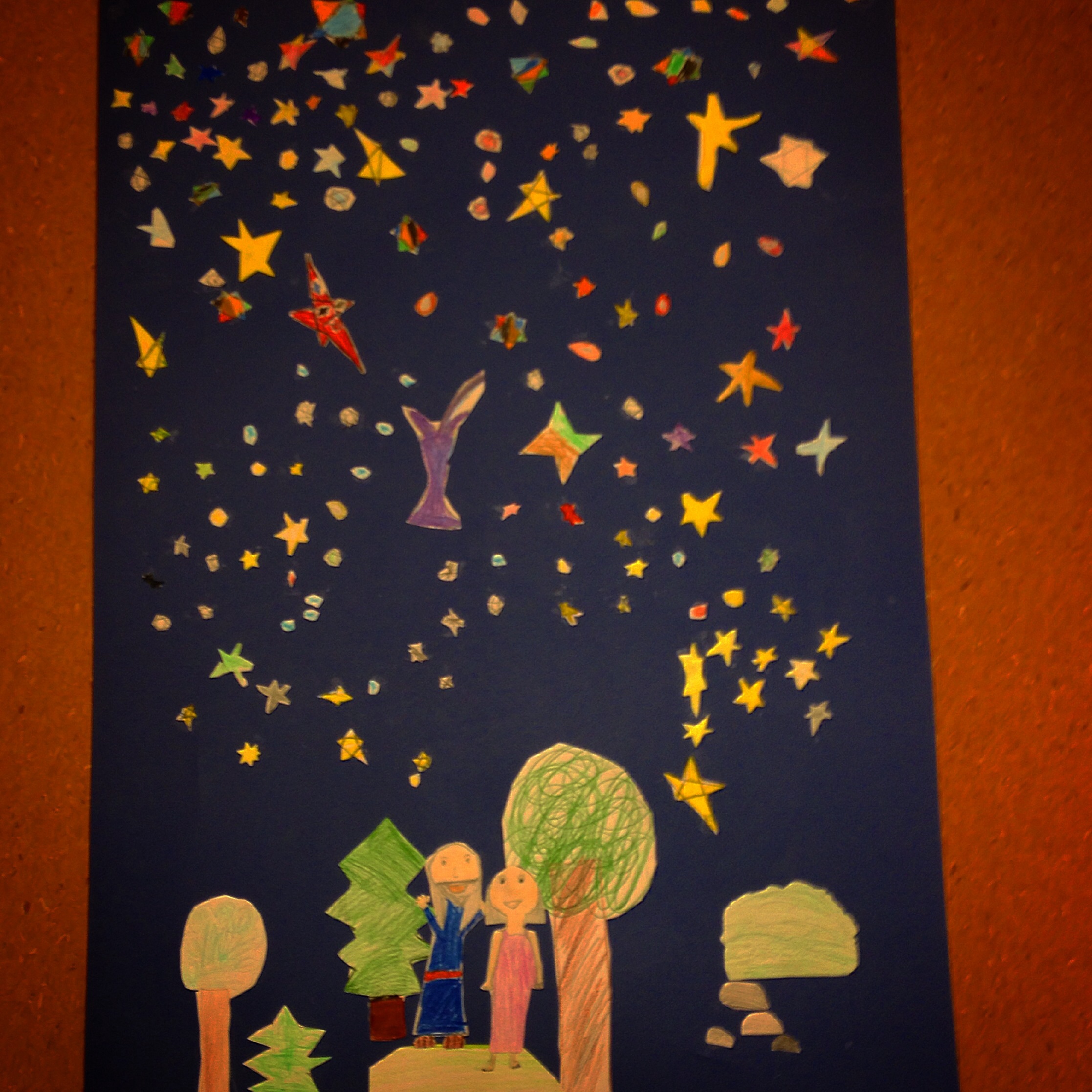 Til slutt kan det vel passa å presentera litt barnekunst. Elevane har lært om Abraham som såg på stjernehimmelen og fekk løfte om ei stor slekt. I dag har elevane laga gruppebilete av hendinga. To av klassane vart ferdige med oppdraget.