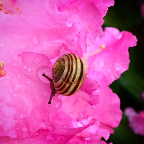 Brunsneglar kan eg styra meg for, men denne vesle gule sneglen som drikk regn på ein knallrosa rhododendron er då ganske fin? Då eg forstørra biletet såg eg ar det såg ut til å vera ein skade i skalet som om han har fått seg ein trøkk, men klart å koma seg på føtene/ foten igjen. Det er kanskje å dra det litt langt å seia at det får vera dagens sundagspreike…