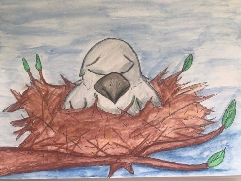 Og så kjem det teikningar og dikt om mange dyreungar som heller ikkje vil sova, for eksempel kråkeungen: