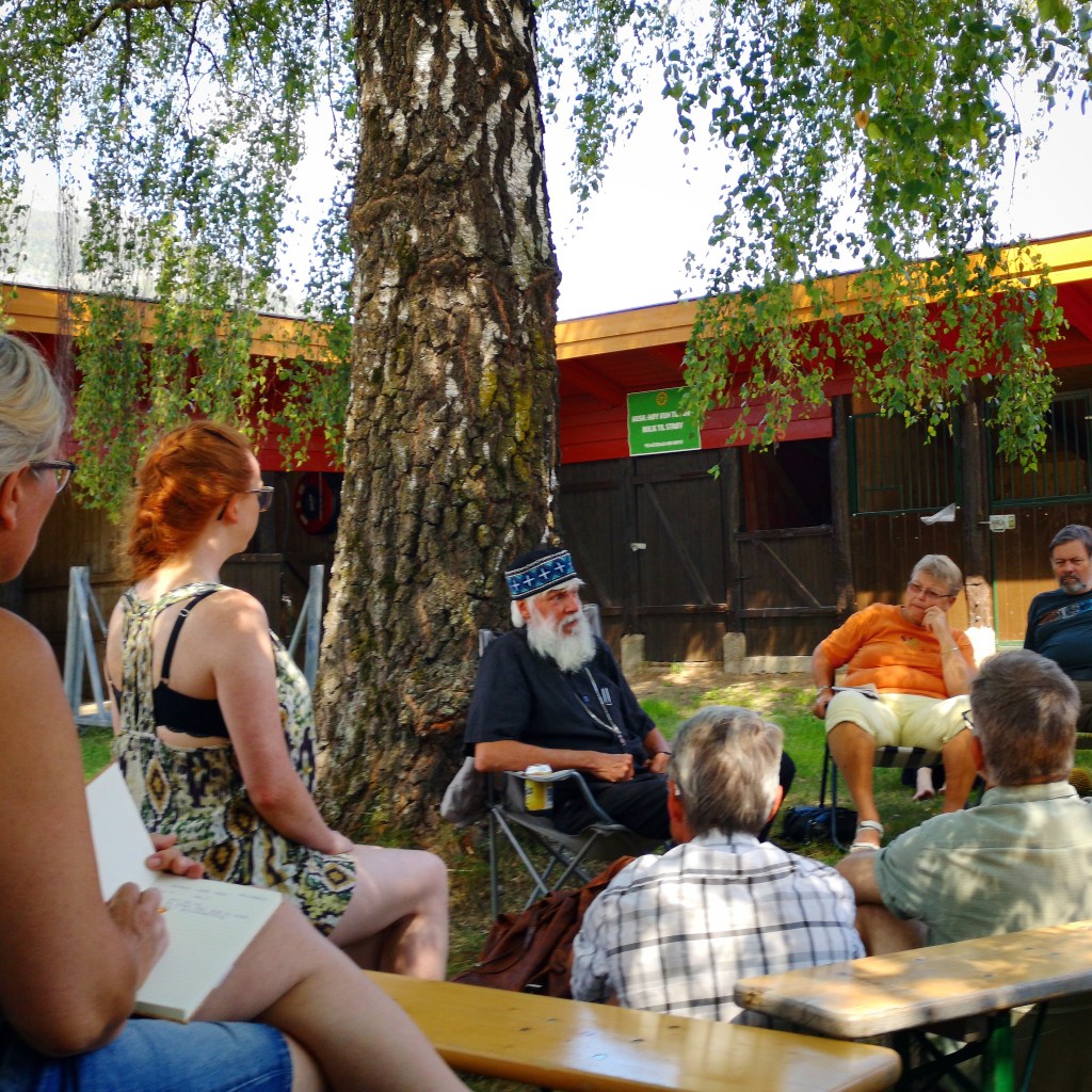 I dette tilfellet kunne eg ikkje dy meg for å setja inn Peter Halldorf som eit eksempel på ansiktet for håp, bare fordi han hadde så fint ansiktsuttrykk på dette biletet. Peter Halldorf er forfattar og teolog og ein usedvanleg klok mann. Han hadde mykje å dela med oss som var på Korsveifestival. På desse festivalane har dei den fine tradisjonen at den som har delt tankane sine på føremiddagen set seg under det store treet i hagen ein times tid slik at dei som har lyst til å vita meir, stilla spørsmål eller samtala om innhaldet kan gjera det. For konstant nyssgjerrige menneske som meg, så er det eitt av høgdepunkta på festivalane.