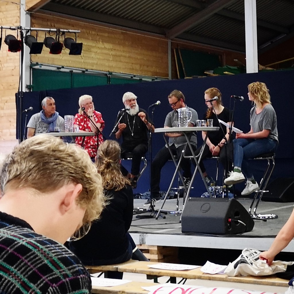 Her er eit bilete frå paneldebatten på folkemøtet. Ein av deltakarane inviterte til eit arrangement som skal foregå i mange byar 30. august, klimabrølet. Folk skal då samla seg framfor rådhusa og brøla for å få dei folkevalde til å innsjå at det er på tide med endringar med det same i håp om å unngå klimakatastrofa som stadig fleire tenkjer på med stigande uro. Hermed er du som les invitert til å vera med og brøla dersom det er eit slikt arrangement i nærleiken av der du bur.