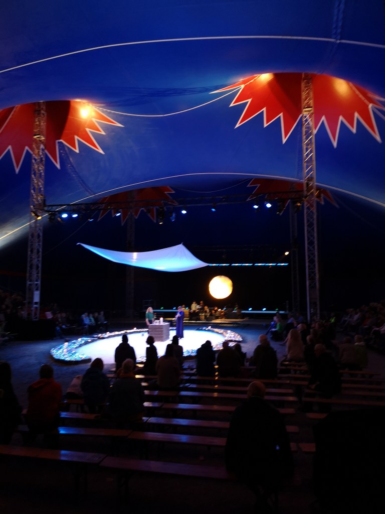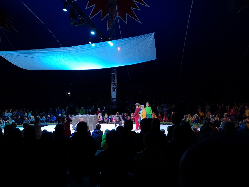 Heilt til slutt vil eg ta med eit bilete som ein kommentar til at noko av det eg synest korsveifestivalane verkeleg lukkast med er å ta med barn og tenåringar og laga opplegg som er på ein slik måte at mykje av programmet kan barn og vaksne oppleva saman. Barna i manesjen er med som skodespelarar i ei fortsetjingsforteljing skriven av Tore Thommasen der barna tek avstand frå den vaksne kjedelege måten å fortelja livet på. Samtidig blir dei forsøkt forført og knebla av ein mindre velmeinande forteljar Mørk som meiner at viss dei forstår kva unike sjansar dei har, og vil spela på hans lag, så kan dei koma til å få forsyna seg godt av ein ryggsekk med pengar som han ber på ryggen.