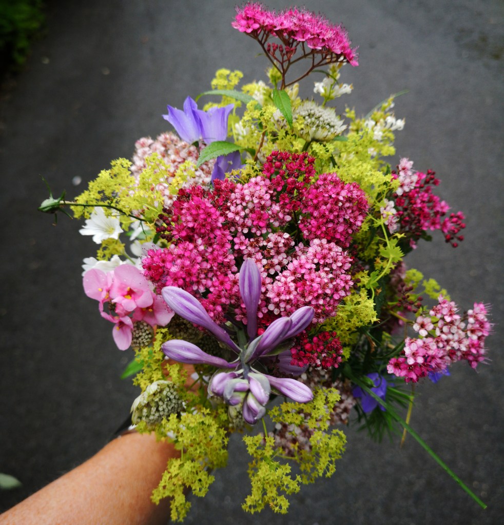Noko av det eg liker med august er denne overveldande mogninga. Heime hos foreldra mine er plommetrea fulle av plommekart, og i drivhuset til far veks det grøne druer og tomatar. Blomsterbeda har han og skikkeleg taket på, så eg snik meg alltid til å få plukka med meg bukettar når eg er heime. Marikåpe vil eg prøva å få tak i til min eigen hage, for planten har så nydeleg grønfarge og gjer seg så godt i bukettar. I dag oppdaga eg kor fint det var i lag med rosespirea.