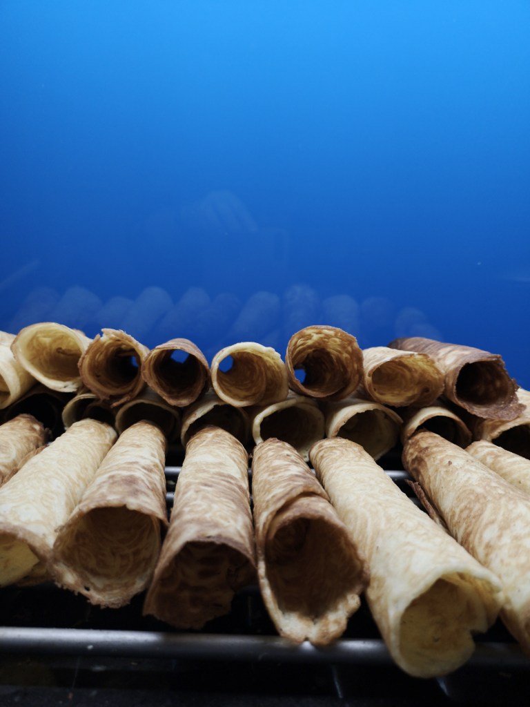 Det er koseleg at Halvard spelar Chopin i stova igjen, og det vart koseleg å baka dei årlege krumkakene. Denne gongen hadde eg til og med eit kremmarhus i tre å kveila dei varme kakene rundt. Likevel kan eg konstatera at dei tradisjonen tru er litt rare og skakke med ulike nyansar i brunfargen. Dette gir meg forsåvidt ei ikkje heilt realistisk kjensle av å vera ei ung og ikkje heilt ferdigutvikla husmor…
