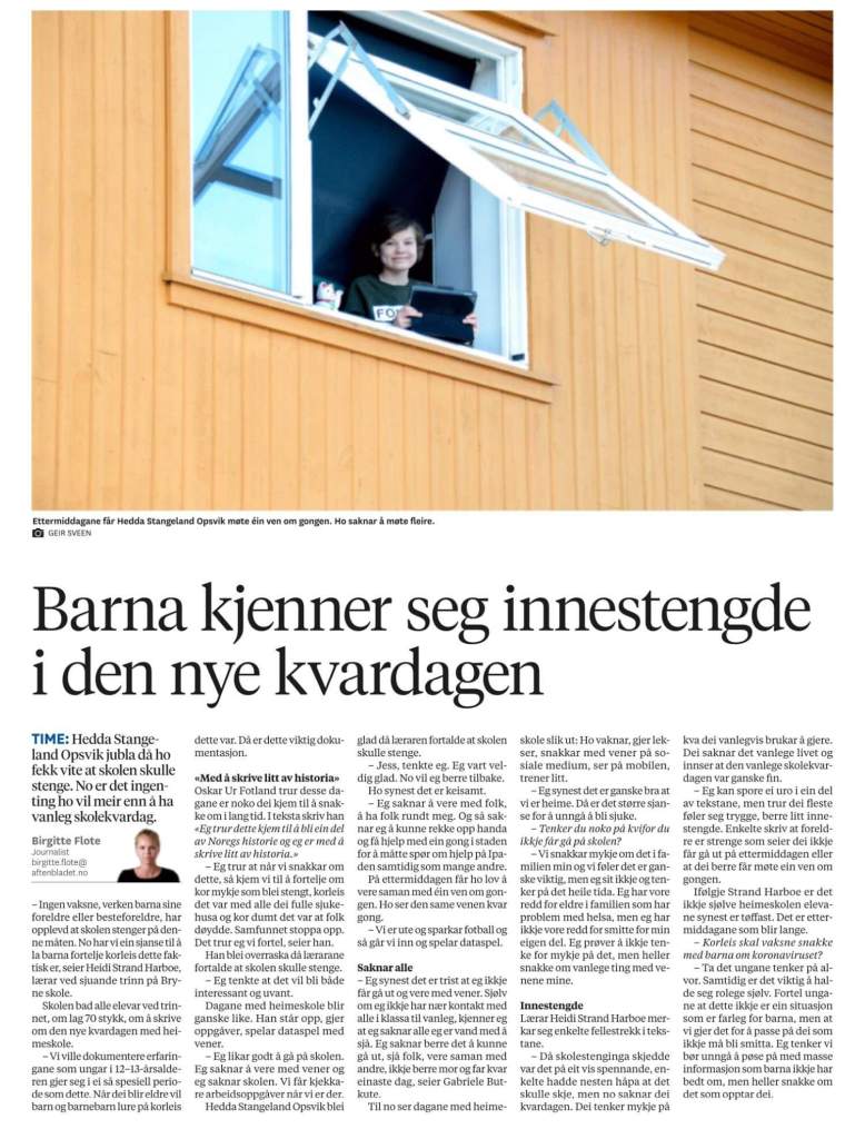 Elevane har skrive tekstar om korleis dei opplever den situasjonen dei er i nå, og litt av bakgrunnen for å senda dei til avisa var at me meiner det er viktig å få autentiske rapportar frå barn om korleis dette blir opplevd frå perspektivet til ein 12-13 åring. Det er sjølvsagt og veldig kjekt for elevane å oppleva at det dei skriv kan brukast til noko «ekte». Takk til Stavanger Aftenblad for godt samarbeid. 🙂