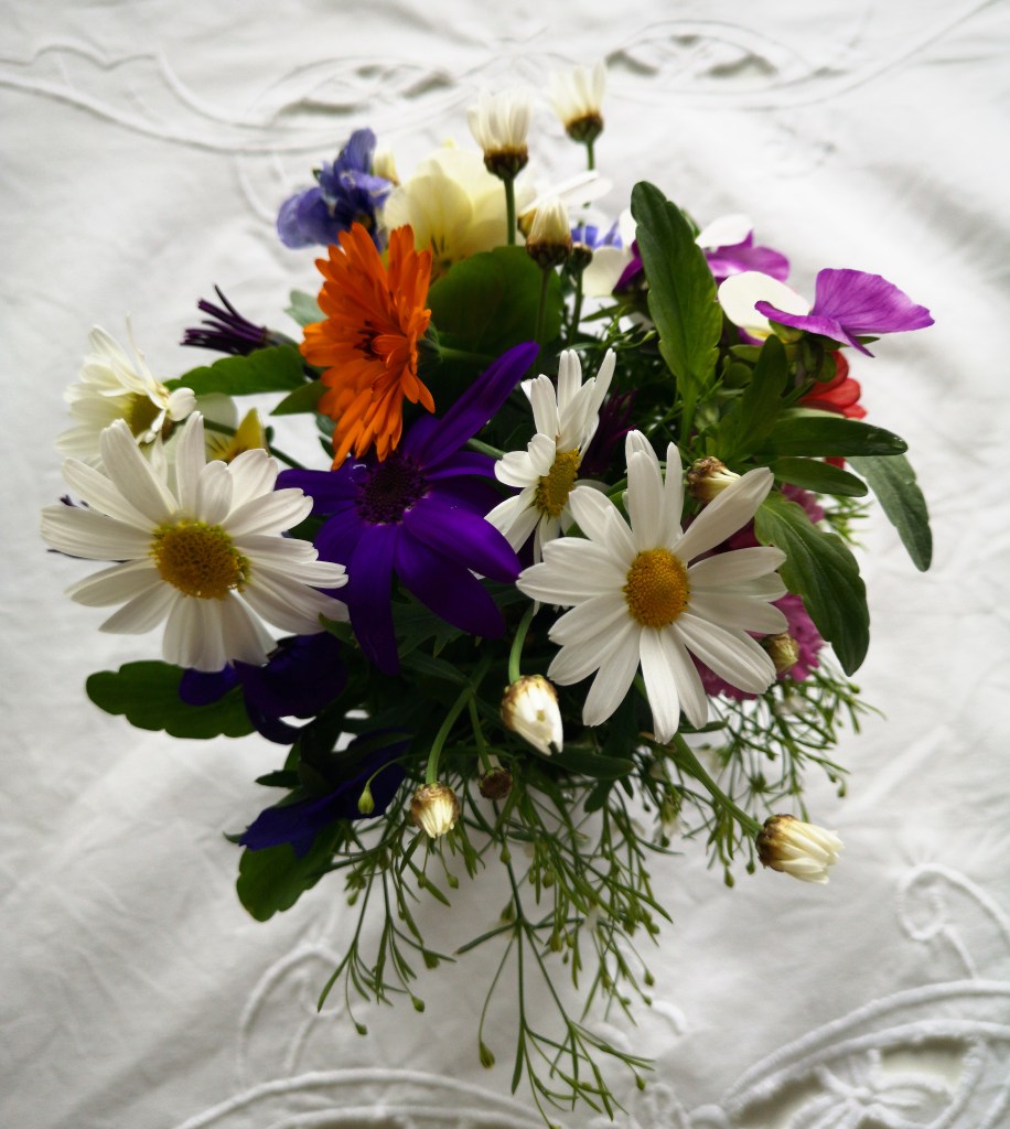 I føremiddag ringde telefonen og Astrid, Torun og Torbjørn song gebursdagssong til meg frå den andre kanten av landet. Så vart det ein lang og koseleg telefonprat. Halvard og Sunniva har ringd frå Oslo. Heldigvis har landet opna så pass opp at eg fekk laga eit lite selskap for den næraste familien. Eg strøyk den kvite blondeduken og plukka blomar i hagen. Heilt i tråd med våre familietradisjonen vart det fort velta eit glas med flytande innhald over duken, og det var heilt i orden. Gullungen kom med stor sløyfe i håret og rosa strutteskjørt og hadde lært å seia «Gratulerer med dagen, mommor». Ho kunne og fortelja alle at «Mommor æ femtini år», sjølvsagt til stor applaus. Ho hadde sjølv vald fine serviettar og te i fin innpakning til mommor, sjølv om ho hadde insistert på å heller gje vekk ein stor bamse.