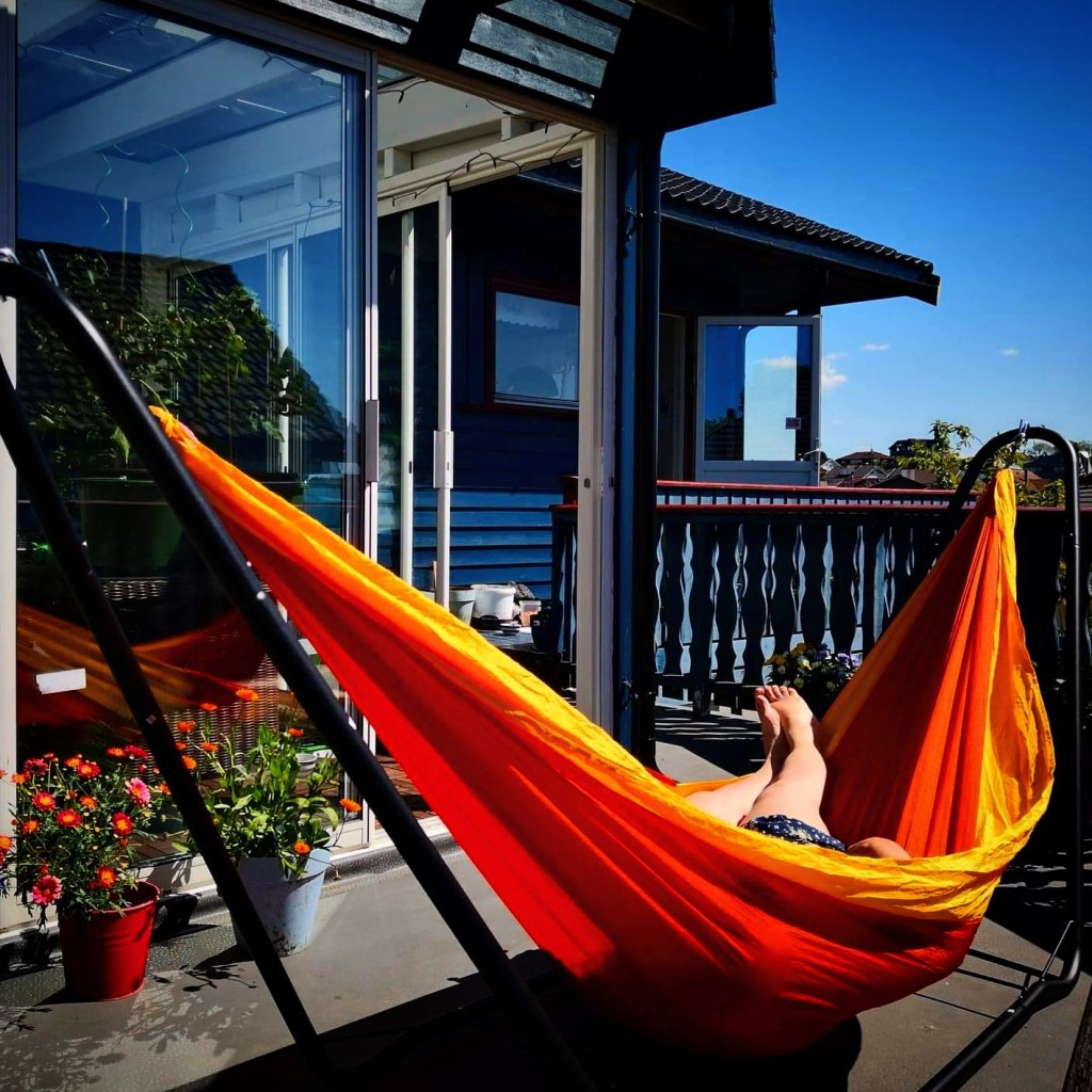 Ei hengekøye i stativ ute på terrassen er ingen dårleg erstatning. Eg må bare læra meg korleis ein kjem oppi og ut av ho på ein tilnærma elegant måte når ein har publikum. Så trur eg ein treng litt trening for ikkje å bli sjøsjuk oppi der, men det gjekk betre etterkvart. Viss me får nokre dagar av denne typen utover sommaren, så kjem ferie i Norge til å vera fantastisk. Me skal tolv både regn og nordavind viss me får tina skikkeleg opp sånn innimellom, og det å tina opp treng me meir enn nokon gong denne sommaren.
