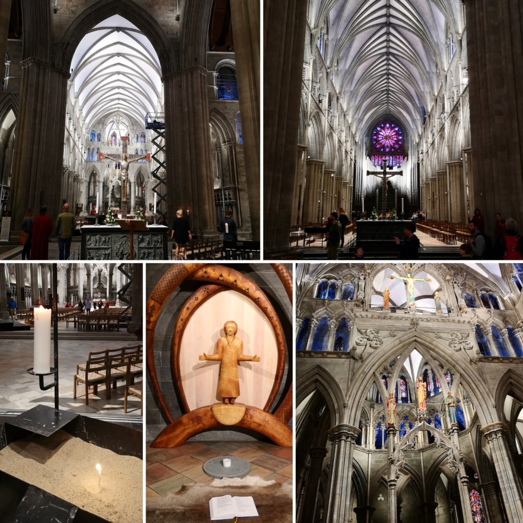Eg blir alltid fyld med ei slags ærefrykt når eg kjem inn i denne katedralen. Det er så storslagent og vakkert. Eg tenkjer på alt det levde menneskelivet og truslivet som er gøymt i dette store rommet opp gjennom tidene og på alle generasjonane som har kome inn hit som pilgrimar eller som innbyggjarar i Trondheim. Sist eg var der sat eg lenge og skreiv, og eg hugsa det som så fint at eg hadde teke med meg skrivebok og penn i dag og. Eg såg på alle menneska med ryggsekkjer og mobiltelefonar som gjekk rundt og knipsa bilete for å ha med seg litt av opplevinga heim.
