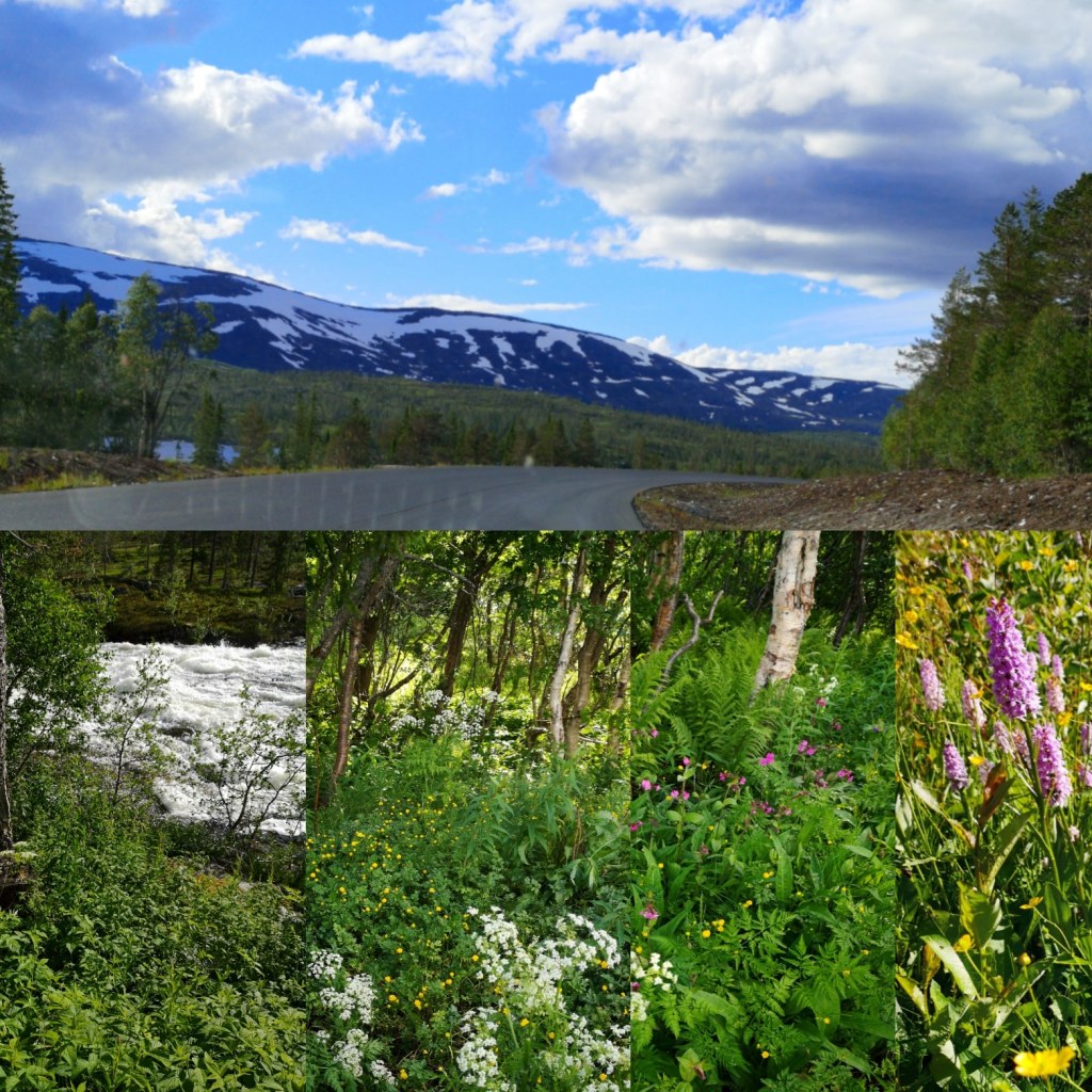 Så bar det vidare. Me stoppa for å lada litt i Steinkjer, og så køyrde me langs endelause trønderske skogar med myrull og markblomar langs vegkanten. Då me nærma oss grensa til Nordland fylke opna landskapet seg, og det dukka opp blå runde fjell med kvite flekkar av snø mot horisonten. Så spennande det er å utforska delar av landet der me ikkje kjenner landskapet frå før.