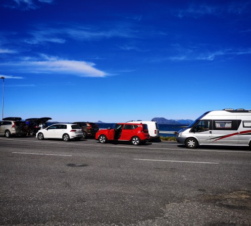 Dersom me hadde starta lenger nord enn me gjorde måtte me ha teke fleire ferger, slik me gjorde det trong me bare ei. Me hadde høyrt at det var ein del turistar langs vegen, så me tenkte det var lurt å vera ute i god tid. Førti minutt før avgang var me der, og då var det allereie ganske mange bilar i køen. Slike kystferger er ikkje alltid så store, så me var slett ikkje sikre på at me ikkje kom til å bli ståande for å venta i alle fall ein avgang.