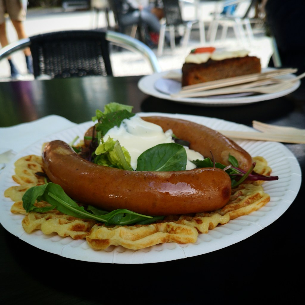 Eva Mari ville gjerne spandera ein kopp kaffi på oss og kom tilbake med noko som må vera ein lokal spesialitet: pølse i potetvaffel… Me hadde ein porsjon på deling. Det smakte interessant.