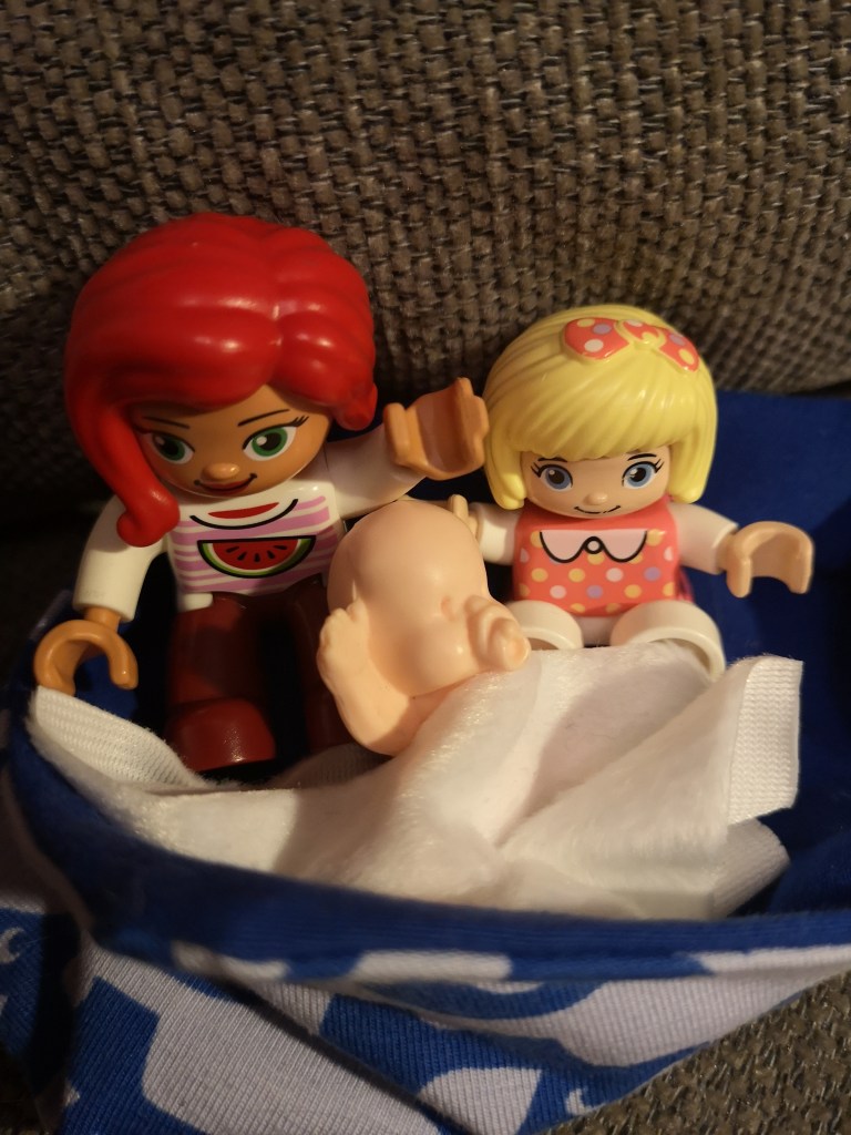 På loftet fann eg nokre små babyfigurar. Ein av dei hadde «tutti» i munnen og fekk duga som den nye babysystera i duplobyen vår. Her får hovudpersonen i byen treffa den nye babyen saman med mamma som er komen tilbake frå sjukehuset.