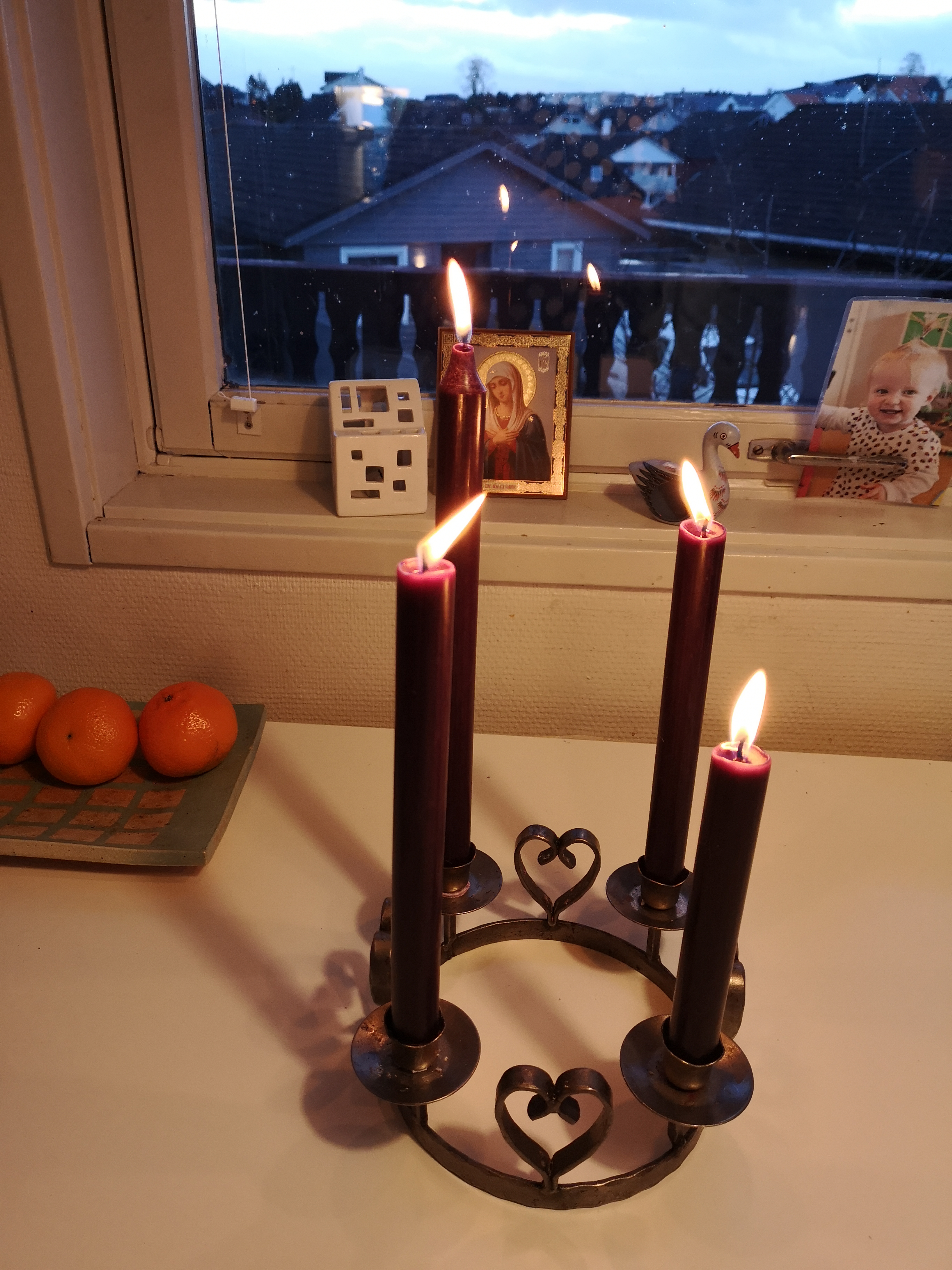 Elles har me hatt ein fin ettermiddag med to tende adventslys (biletet av fire lys er frå i fjor), i lag med mormorgulla og foreldra deira. Livet er godt.