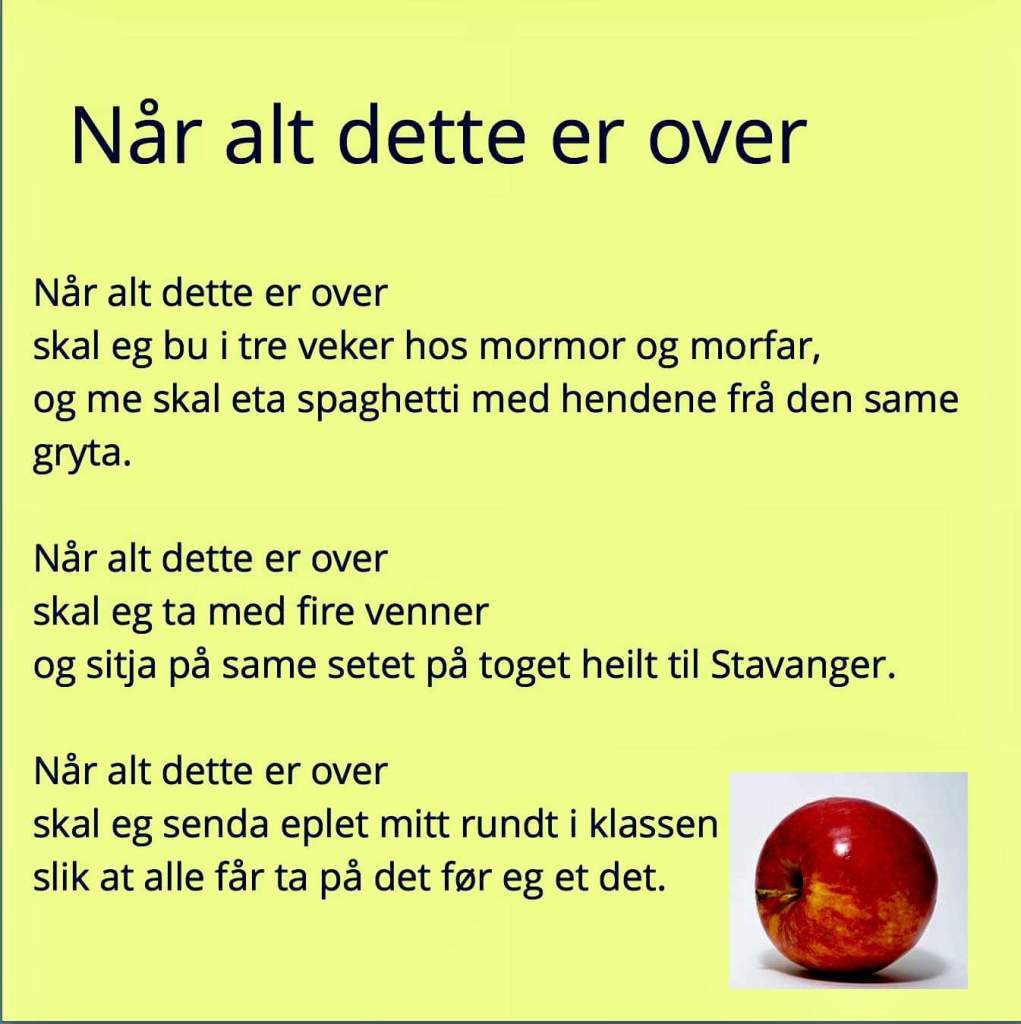 Eg har fått heim dei to som bur i Oslo. Eg er så glad for å ha dei her. Det blir ei spesiell jul, men eg trur det kan bli bra likevel. Me får ikkje vera i lag med alle dei me pleier å vera i lag med, men til neste år håpar eg at det kanskje er blitt normalt igjen. Då eg leitte etter munkene kom eg over bilete av tekstar sjuandeklassingane mine skreiv i vår då me hadde heimeskule. Eg trur eg tek sjansen på å dela eit par av dei, for dei smilte så fint til meg då eg såg dei liggja der på hard-disken. Dette er like aktuelt framleis som det var ved påsketider.