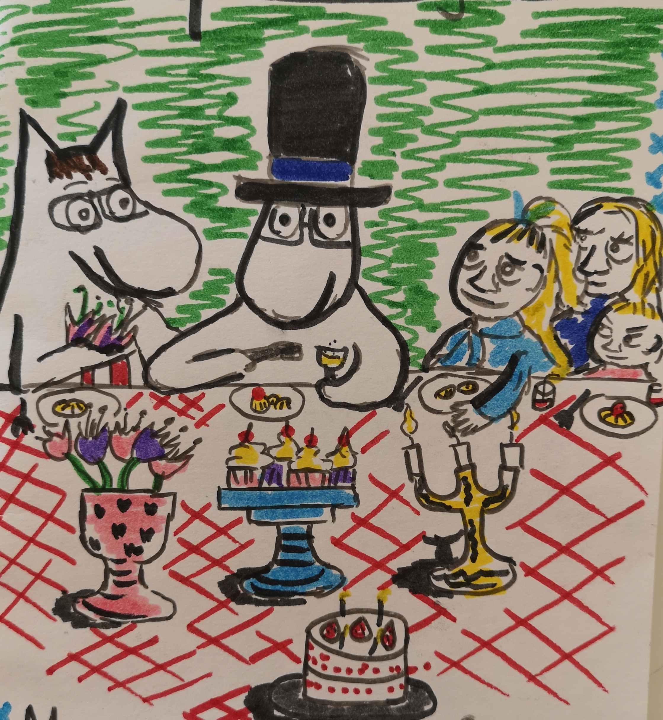 For to veker sidan fekk me dette fine kortet. Det er barnebarnet på 3 1/2 som har bestemt motivet, og mamma måtte hjelpa til med teikninga. Her er morfar mummipappa og mormor mummimamma. Barnebarnet, veslesyster og mamma er tre mymler. Det er sommar og me har selskap i hagen og et bløtkake og muffins.
