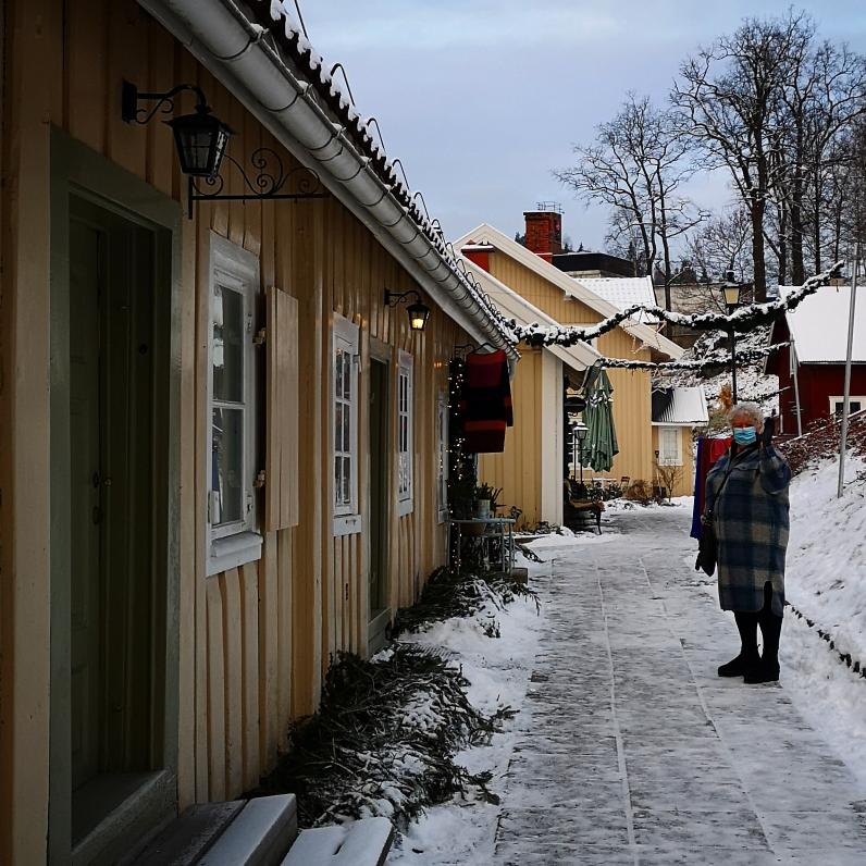 På Bærums verk torsdag føremiddag var det koronavennleg og stille, ein perfekt dag for ein førjuls dametur. Me var nesten aleine i fleire av dei små butikkane og ute var det snø, parafinlykter som lyste og ei elv der isen la seg. Munnbind, briller og rå frostrøyk viste seg å vera ein vanskeleg kombinasjon. Kvar gong eg gjekk inn i eit hus la det seg eit tjukt ugjennomtrengeleg skoddelag på brilleglasa, det var bare å håpa at ein ikkje skubba borti ei nyblåst glaslykt eller noko slikt før synet kom tilbake. På vegen heim måtte me innom i Sandvika slik at eg kunne kjøpa eit ekstra lag tynn ull å ha under dei andre kleda. Så var me innom Panduro og kom ut med masse hobbymateriell, så her kan det fort bli ein lokalt juleverkstad i løpet av helga.