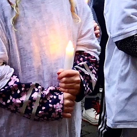 Etter lystenning, opning av adventskalender, litt øving på songane og forteljinga om Santa Lucia, tredde ungane på seg kvite T-skjorter over dressar, regntøy og ytterjakkar. På ei tralle drog me med oss ein sound-blaster med musikken vår. Då me nærma oss målet fekk alle delt ut kvar sitt led-lys og den eine adventkransen fekk gjera jobben som Luciakrone.