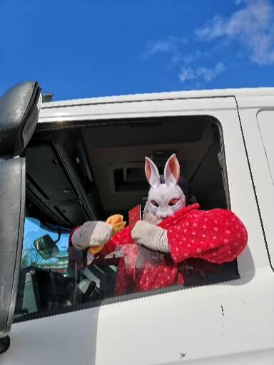 Då eg hadde fått lånt lastebil og lokka mannen til å kjøra meg til Sandnes for å filma, var det vanskeleg å få han til å forstå at han nesten måtte liggja med frontruta i ryggen for å filma bunnyen som skulle styra bilen og sjå rett fram. Eg frykta at ingen fekk med det vesle poenget at kaninen åt gulrot i brød i staden for pølse. Det var og hardt å takla at det ikkje vart eit nytt opptak sjølv om munnsløret løsna frå maska på slutten av opptaket sånn at munn og hake kom til syne. «Nei, vet du hva Heidi, nå orker jeg ikke mer!»