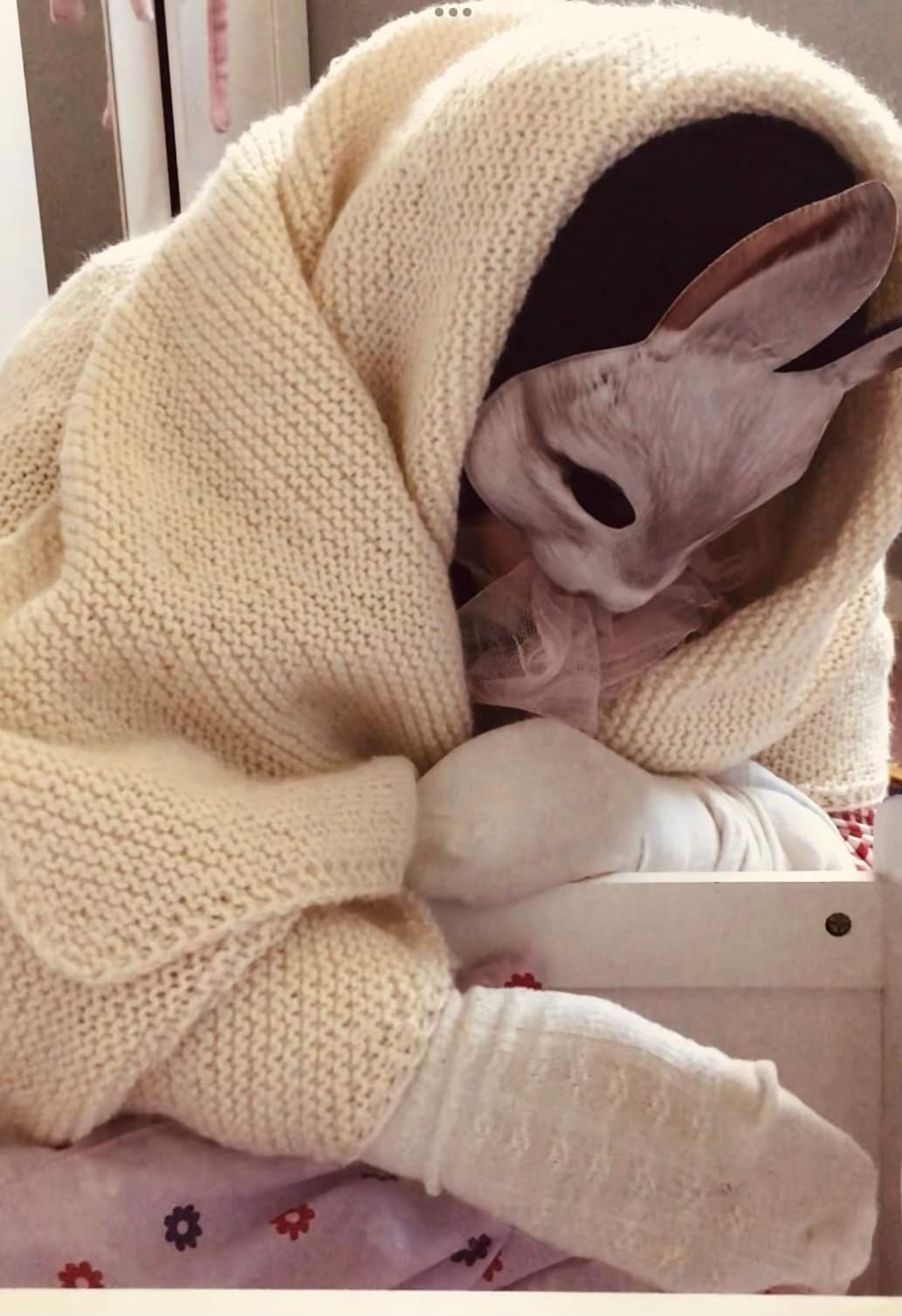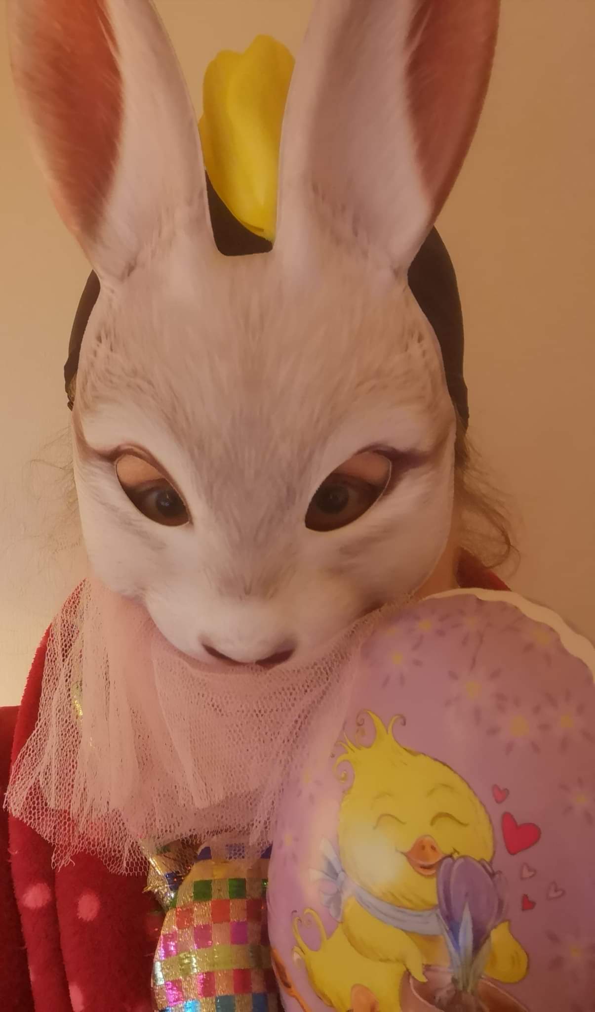 Den maska viste seg å vera tapt, og ingen i familien hadde masker eg kunne bruka heller. Eg sykla ned til Bryne for å tråla meg gjennom dei butikkane som kunne tenkjast å ha masker, men sidan karnevalstidene for lengst var over var ikkje det heller akkurat noko eldorado for ein maskehungrig kunde. Det einaste eg fann, halvvegs bortgøymd i ei hylle i ein leikebutikk, var ei kaninmaske og ei revemaske, begge halvmasker, og begge litt for små. Det fekk bli ei av dei. Sidan det snart var påske, valde eg kaninen og spurta heim for å leita etter kostyme. Ei badehette for å skjula håret, ei prikkete pusete morgonkåpe, ein fargerik stoffrest til sjal, og til slutt ei rosa tyllstrimle lagt firedobbelt for å skjula at halvmaska ikkje dekka munn og hakepartiet. Eit påskeegg i hendene og ein rask selfie. Miss Bunny hadde sett dagens lys og trong ikkje å manifistera seg på film før etter påske.