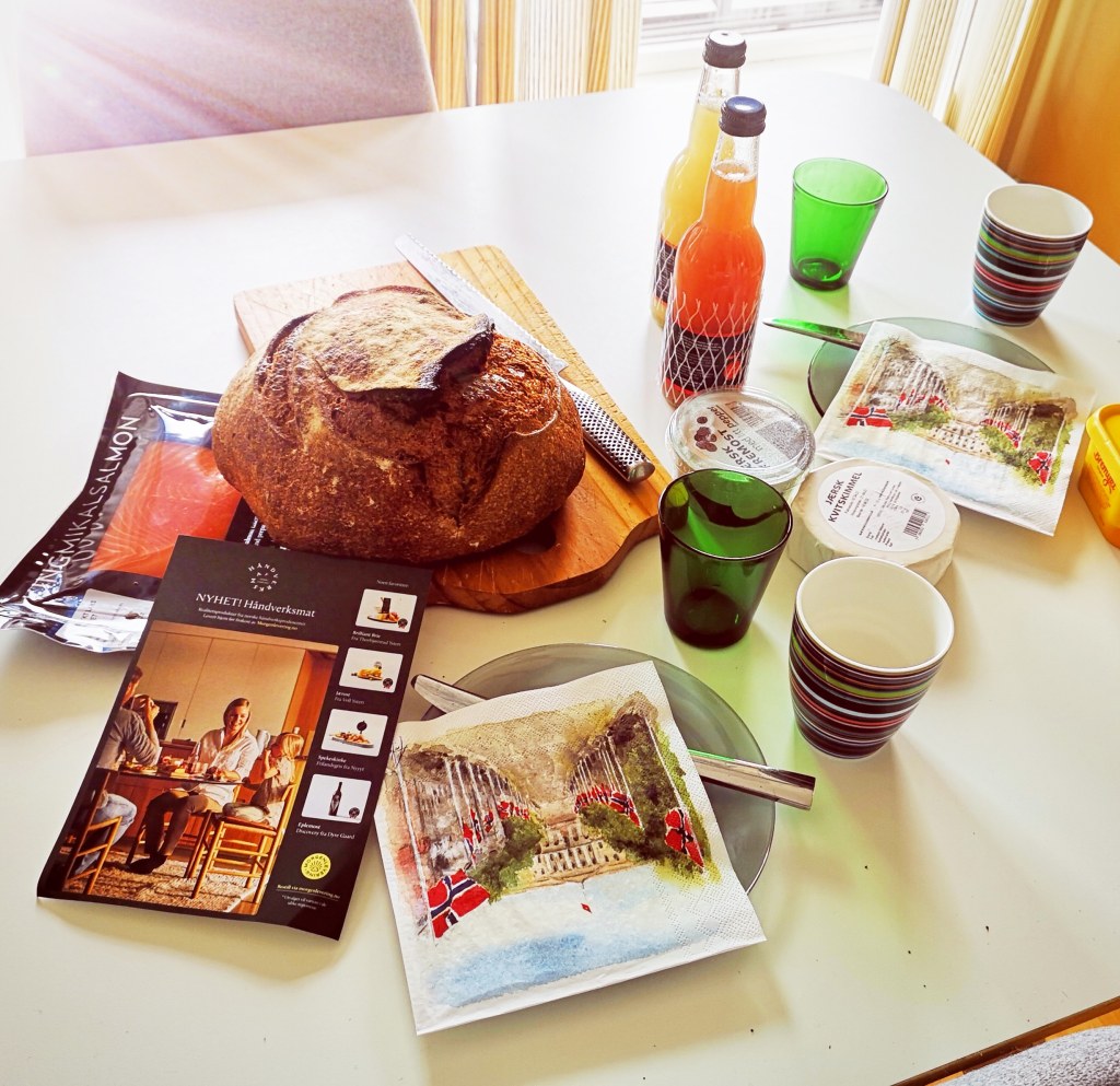 Då eg vakna i dag fekk eg melding på telefonen om at det var levert frokost på døra. Det var ei koseleg helsing frå Halvard, Sunniva, Therese og Trygve i Oslo, og som det stod i helsinga som fulgte med, eit slags plaster på koronasåret. Det smakte veldig godt, og omtanken bak var hjartevarmande. Me hadde til og med 17.mai-serviettar igjen som kunne gjera oppdekninga nesten litt kongeleg. Før 17.mai fekk fireåringen velja serviettar til 17.mai-lunsjen, og då kunne det ikkje gjerast betre enn bilete av norske flagg og kongen sitt slott.