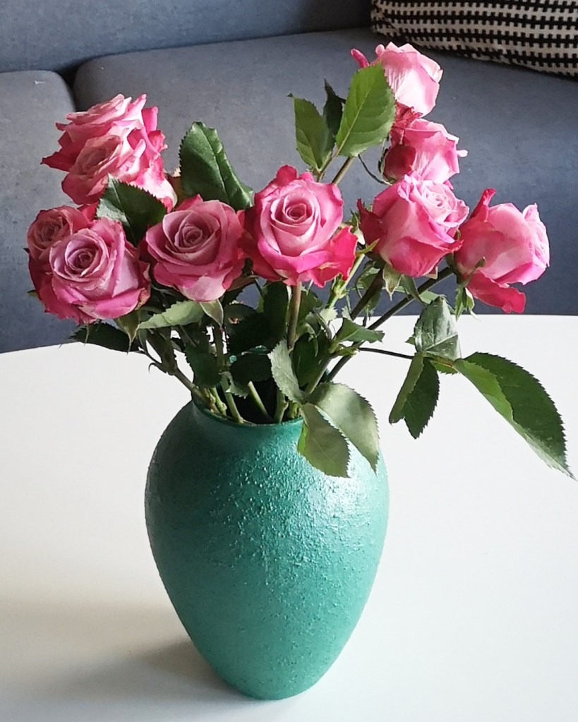 Og viss nokon måtte lura. Den knallgrøne vasen på biletet er ein gebursdagspresang frå ei venninne. Det vart så fint med rosa roser oppi.