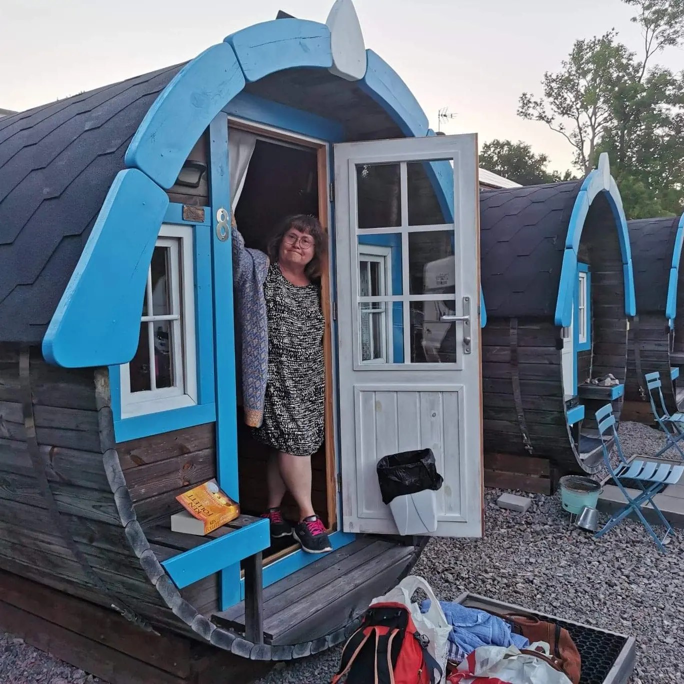 På campingplassen var det mest vsmingvogner, og dei stod tett. Så var det to rekkjer med tønnehytter og ei rekkje med litt større hytter. Inne i tønna var det vindauge i begge ender slik at ein kunne kikka ut. Mellom rekkjene var det hekkar som viste seg å bestå av rips- og solbærbuskar. Campingplassen låg ved ein idyllisk sjø og veret her er heilt nydeleg. Alt i alt ende dette opp som ei sjarmerande erfaring, og eg kunne faktisk ha blitt mykje lenger i tønna om det hadde falt seg slik sjølv om førsteinntrykket må seiast å vera sjokkblanda vantru.