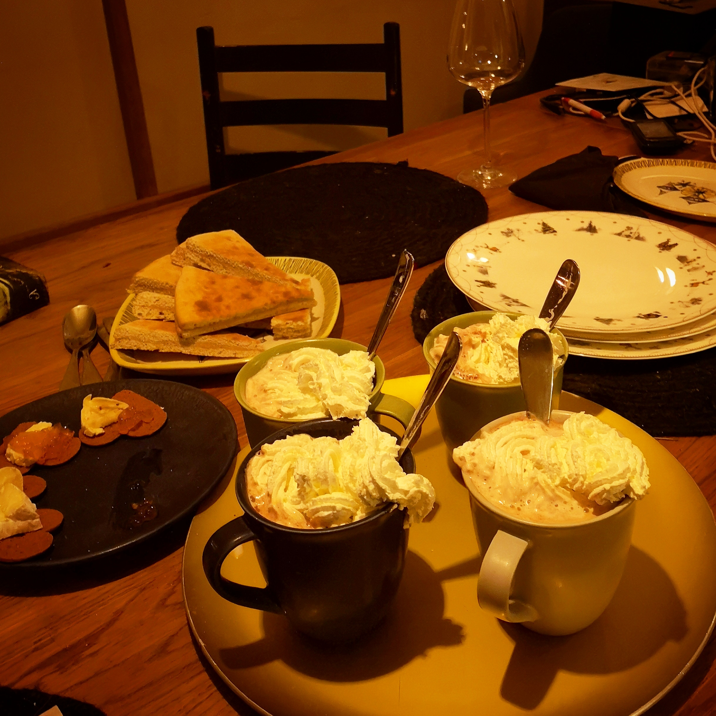 Det er godt for sjel og sinn med rolege morgonar med kaffi, adventlys, strikketøy, musikk på radioen og godt selskap medan det seine desembermorgonlyset vaknar utanfor vindauget. Sidan eg er overbevist om at det av og til er sunt å vera litt usunn, tek eg sjansen på å visa bilete av ettermiddagskaffien vår andre sundag i advent, beståande av glovarm chilisjokolade med kremtopp, lefse og peparkaker med marmelade og blåmuggost. Det gjorde godt i litt kalde desemberkroppar.