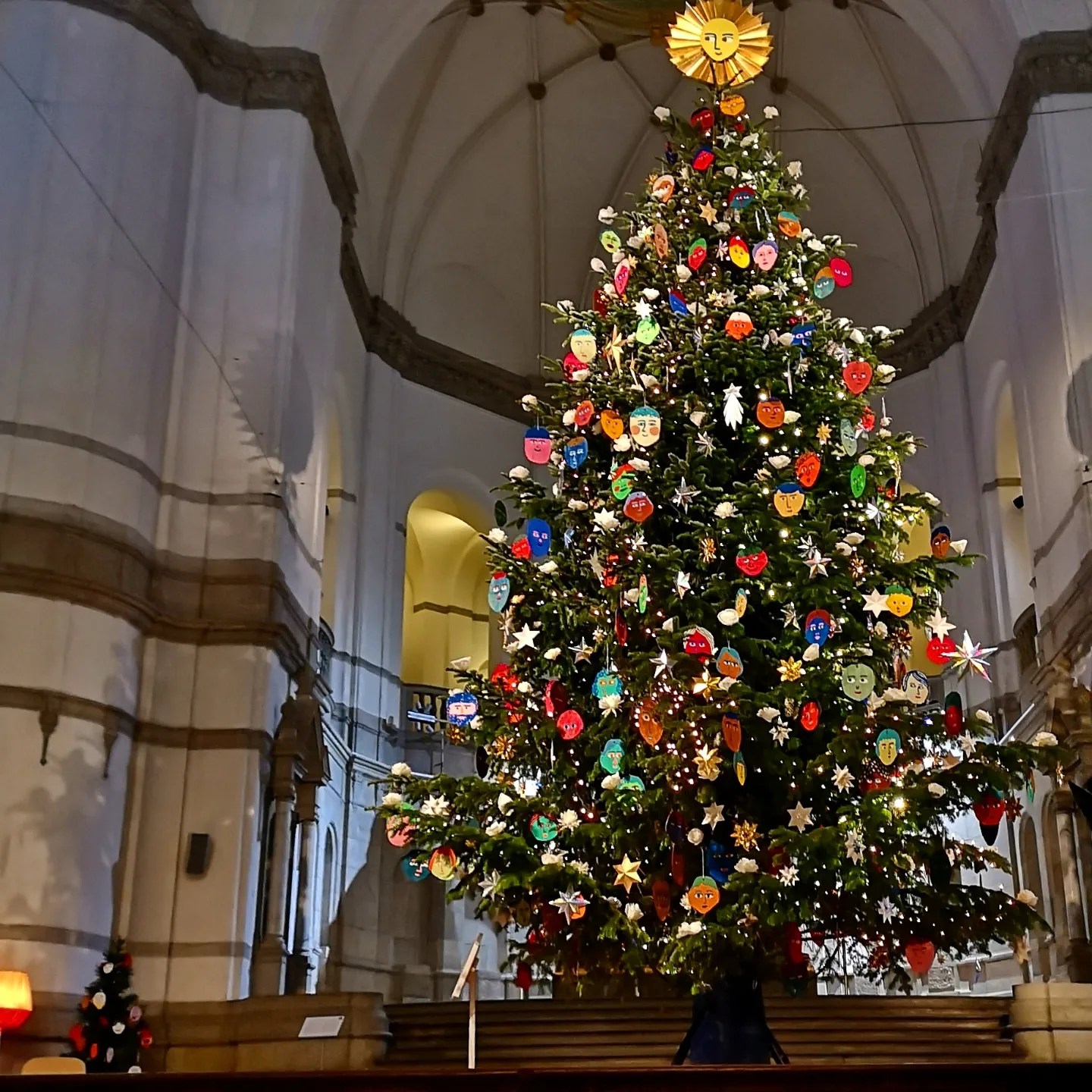 Dette eer juletreet på nordiska museet. Det er pynta av ein kunstnar som har malt mange naivistiske ansikt og hengt på med ei stor sol på toppen. Bodskapet var eit inkluderande og samlande samfunn og ei unkluderande julefeiring. Det går me for sånn avslutningsvis i dag.