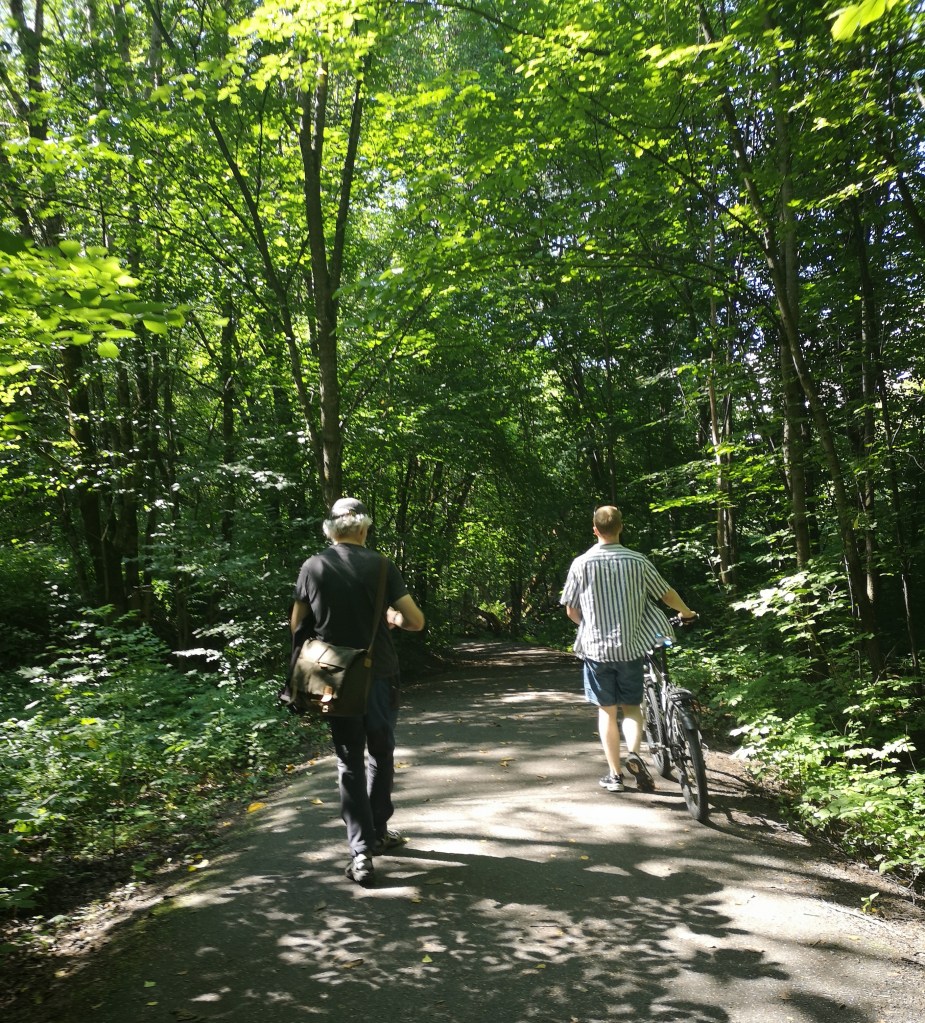 Halvard foreslo at me kunne gå tilbake til byen ned ein tursti langs Alnaelva. Det gjorde at me oppdaga eit nytt nydeleg turområde i Oslo. Det øverste biletet er der i frå. Me gjekk ned til gamlebyen og då me nærma oss Vålerenga kirke fekk me med oss klokkeringing og nydeleg klokkespel, kanskje i anledning av olsokmesse?